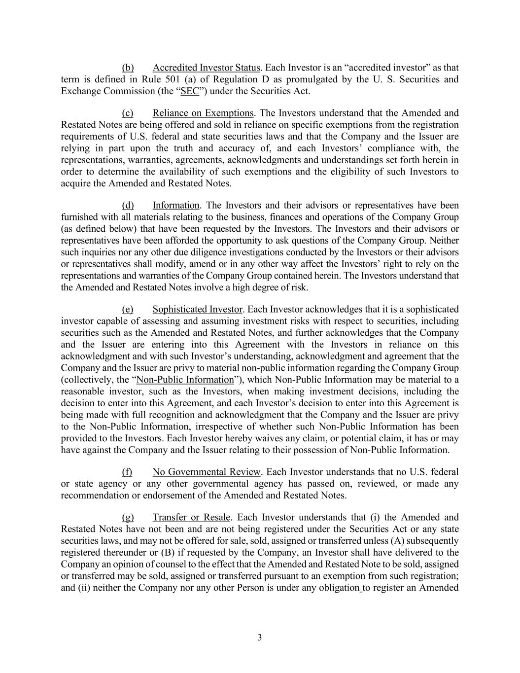 3 (b) Accredited Investor Status. Each Investor is an “accredited investor” as that term is defined in Rule 501 (a) of Regulation D as promulgated by the U. S. Securities and Exchange Commission (the “SEC”) under the Securities Act. (c) Reliance on Exemptions. The Investors understand that the Amended and Restated Notes are being offered and sold in reliance on specific exemptions from the registration requirements of U.S. federal and state securities laws and that the Company and the Issuer are relying in part upon the truth and accuracy of, and each Investors’ compliance with, the representations, warranties, agreements, acknowledgments and understandings set forth herein in order to determine the availability of such exemptions and the eligibility of such Investors to acquire the Amended and Restated Notes. (d) Information. The Investors and their advisors or representatives have been furnished with all materials relating to the business, finances and operations of the Company Group (as defined below) that have been requested by the Investors. The Investors and their advisors or representatives have been afforded the opportunity to ask questions of the Company Group. Neither such inquiries nor any other due diligence investigations conducted by the Investors or their advisors or representatives shall modify, amend or in any other way affect the Investors’ right to rely on the representations and warranties of the Company Group contained herein. The Investors understand that the Amended and Restated Notes involve a high degree of risk. (e) Sophisticated Investor. Each Investor acknowledges that it is a sophisticated investor capable of assessing and assuming investment risks with respect to securities, including securities such as the Amended and Restated Notes, and further acknowledges that the Company and the Issuer are entering into this Agreement with the Investors in reliance on this acknowledgment and with such Investor’s understanding, acknowledgment and agreement that the Company and the Issuer are privy to material non-public information regarding the Company Group (collectively, the “Non-Public Information”), which Non-Public Information may be material to a reasonable investor, such as the Investors, when making investment decisions, including the decision to enter into this Agreement, and each Investor’s decision to enter into this Agreement is being made with full recognition and acknowledgment that the Company and the Issuer are privy to the Non-Public Information, irrespective of whether such Non-Public Information has been provided to the Investors. Each Investor hereby waives any claim, or potential claim, it has or may have against the Company and the Issuer relating to their possession of Non-Public Information. (f) No Governmental Review. Each Investor understands that no U.S. federal or state agency or any other governmental agency has passed on, reviewed, or made any recommendation or endorsement of the Amended and Restated Notes. (g) Transfer or Resale. Each Investor understands that (i) the Amended and Restated Notes have not been and are not being registered under the Securities Act or any state securities laws, and may not be offered for sale, sold, assigned or transferred unless (A) subsequently registered thereunder or (B) if requested by the Company, an Investor shall have delivered to the Company an opinion of counsel to the effect that the Amended and Restated Note to be sold, assigned or transferred may be sold, assigned or transferred pursuant to an exemption from such registration; and (ii) neither the Company nor any other Person is under any obligation to register an Amended