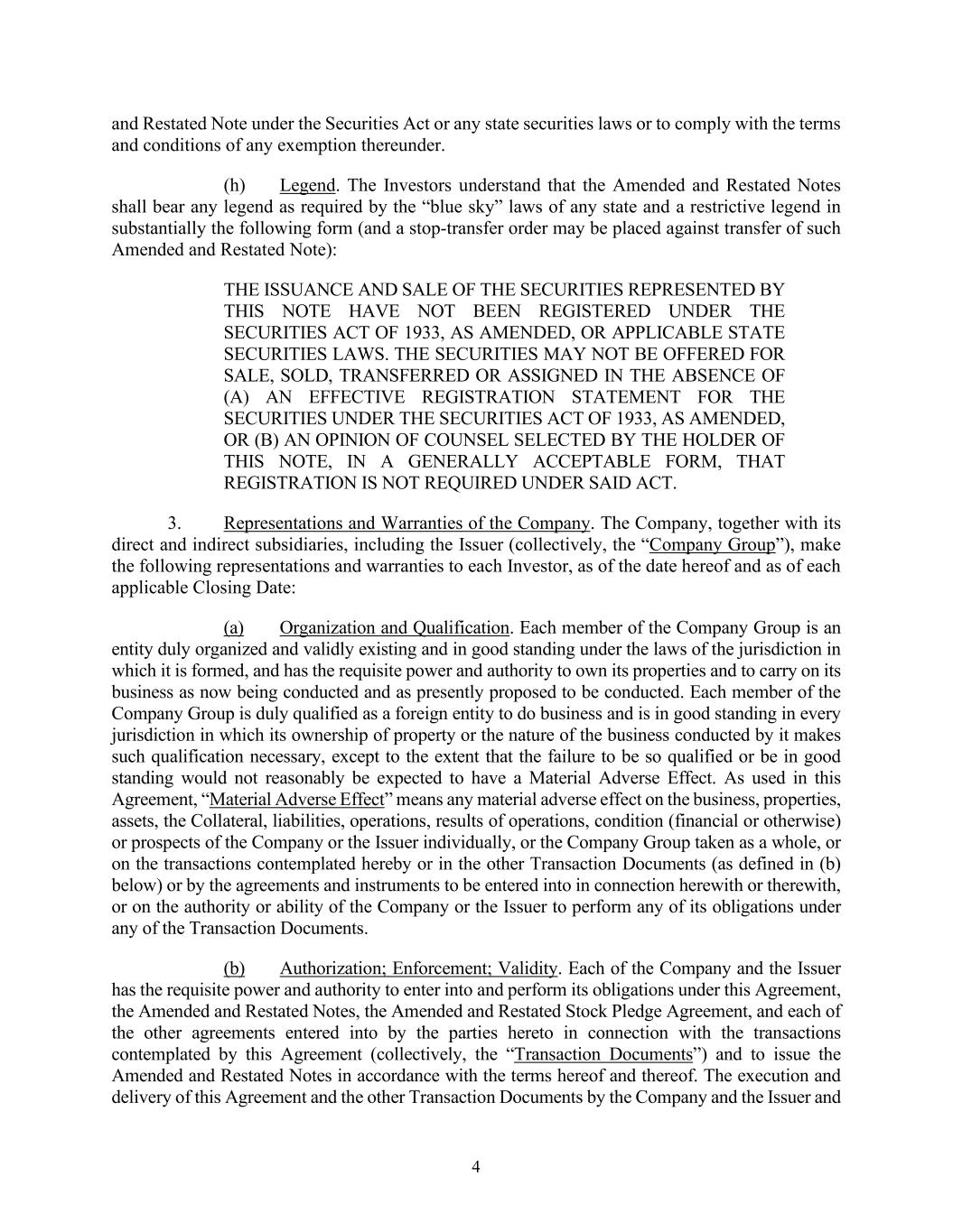 4 and Restated Note under the Securities Act or any state securities laws or to comply with the terms and conditions of any exemption thereunder. (h) Legend. The Investors understand that the Amended and Restated Notes shall bear any legend as required by the “blue sky” laws of any state and a restrictive legend in substantially the following form (and a stop-transfer order may be placed against transfer of such Amended and Restated Note): THE ISSUANCE AND SALE OF THE SECURITIES REPRESENTED BY THIS NOTE HAVE NOT BEEN REGISTERED UNDER THE SECURITIES ACT OF 1933, AS AMENDED, OR APPLICABLE STATE SECURITIES LAWS. THE SECURITIES MAY NOT BE OFFERED FOR SALE, SOLD, TRANSFERRED OR ASSIGNED IN THE ABSENCE OF (A) AN EFFECTIVE REGISTRATION STATEMENT FOR THE SECURITIES UNDER THE SECURITIES ACT OF 1933, AS AMENDED, OR (B) AN OPINION OF COUNSEL SELECTED BY THE HOLDER OF THIS NOTE, IN A GENERALLY ACCEPTABLE FORM, THAT REGISTRATION IS NOT REQUIRED UNDER SAID ACT. 3. Representations and Warranties of the Company. The Company, together with its direct and indirect subsidiaries, including the Issuer (collectively, the “Company Group”), make the following representations and warranties to each Investor, as of the date hereof and as of each applicable Closing Date: (a) Organization and Qualification. Each member of the Company Group is an entity duly organized and validly existing and in good standing under the laws of the jurisdiction in which it is formed, and has the requisite power and authority to own its properties and to carry on its business as now being conducted and as presently proposed to be conducted. Each member of the Company Group is duly qualified as a foreign entity to do business and is in good standing in every jurisdiction in which its ownership of property or the nature of the business conducted by it makes such qualification necessary, except to the extent that the failure to be so qualified or be in good standing would not reasonably be expected to have a Material Adverse Effect. As used in this Agreement, “Material Adverse Effect” means any material adverse effect on the business, properties, assets, the Collateral, liabilities, operations, results of operations, condition (financial or otherwise) or prospects of the Company or the Issuer individually, or the Company Group taken as a whole, or on the transactions contemplated hereby or in the other Transaction Documents (as defined in (b) below) or by the agreements and instruments to be entered into in connection herewith or therewith, or on the authority or ability of the Company or the Issuer to perform any of its obligations under any of the Transaction Documents. (b) Authorization; Enforcement; Validity. Each of the Company and the Issuer has the requisite power and authority to enter into and perform its obligations under this Agreement, the Amended and Restated Notes, the Amended and Restated Stock Pledge Agreement, and each of the other agreements entered into by the parties hereto in connection with the transactions contemplated by this Agreement (collectively, the “Transaction Documents”) and to issue the Amended and Restated Notes in accordance with the terms hereof and thereof. The execution and delivery of this Agreement and the other Transaction Documents by the Company and the Issuer and