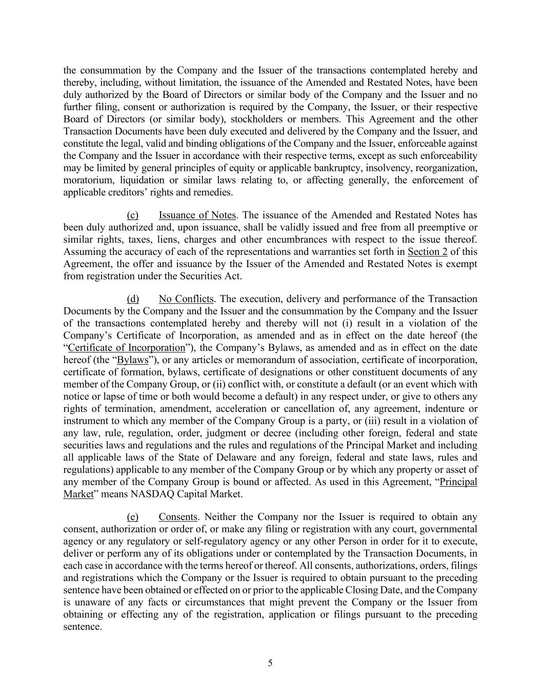 5 the consummation by the Company and the Issuer of the transactions contemplated hereby and thereby, including, without limitation, the issuance of the Amended and Restated Notes, have been duly authorized by the Board of Directors or similar body of the Company and the Issuer and no further filing, consent or authorization is required by the Company, the Issuer, or their respective Board of Directors (or similar body), stockholders or members. This Agreement and the other Transaction Documents have been duly executed and delivered by the Company and the Issuer, and constitute the legal, valid and binding obligations of the Company and the Issuer, enforceable against the Company and the Issuer in accordance with their respective terms, except as such enforceability may be limited by general principles of equity or applicable bankruptcy, insolvency, reorganization, moratorium, liquidation or similar laws relating to, or affecting generally, the enforcement of applicable creditors’ rights and remedies. (c) Issuance of Notes. The issuance of the Amended and Restated Notes has been duly authorized and, upon issuance, shall be validly issued and free from all preemptive or similar rights, taxes, liens, charges and other encumbrances with respect to the issue thereof. Assuming the accuracy of each of the representations and warranties set forth in Section 2 of this Agreement, the offer and issuance by the Issuer of the Amended and Restated Notes is exempt from registration under the Securities Act. (d) No Conflicts. The execution, delivery and performance of the Transaction Documents by the Company and the Issuer and the consummation by the Company and the Issuer of the transactions contemplated hereby and thereby will not (i) result in a violation of the Company’s Certificate of Incorporation, as amended and as in effect on the date hereof (the “Certificate of Incorporation”), the Company’s Bylaws, as amended and as in effect on the date hereof (the “Bylaws”), or any articles or memorandum of association, certificate of incorporation, certificate of formation, bylaws, certificate of designations or other constituent documents of any member of the Company Group, or (ii) conflict with, or constitute a default (or an event which with notice or lapse of time or both would become a default) in any respect under, or give to others any rights of termination, amendment, acceleration or cancellation of, any agreement, indenture or instrument to which any member of the Company Group is a party, or (iii) result in a violation of any law, rule, regulation, order, judgment or decree (including other foreign, federal and state securities laws and regulations and the rules and regulations of the Principal Market and including all applicable laws of the State of Delaware and any foreign, federal and state laws, rules and regulations) applicable to any member of the Company Group or by which any property or asset of any member of the Company Group is bound or affected. As used in this Agreement, “Principal Market” means NASDAQ Capital Market. (e) Consents. Neither the Company nor the Issuer is required to obtain any consent, authorization or order of, or make any filing or registration with any court, governmental agency or any regulatory or self-regulatory agency or any other Person in order for it to execute, deliver or perform any of its obligations under or contemplated by the Transaction Documents, in each case in accordance with the terms hereof or thereof. All consents, authorizations, orders, filings and registrations which the Company or the Issuer is required to obtain pursuant to the preceding sentence have been obtained or effected on or prior to the applicable Closing Date, and the Company is unaware of any facts or circumstances that might prevent the Company or the Issuer from obtaining or effecting any of the registration, application or filings pursuant to the preceding sentence.