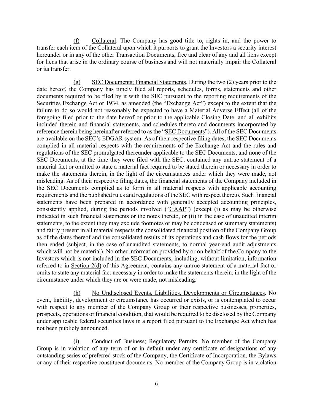 6 (f) Collateral. The Company has good title to, rights in, and the power to transfer each item of the Collateral upon which it purports to grant the Investors a security interest hereunder or in any of the other Transaction Documents, free and clear of any and all liens except for liens that arise in the ordinary course of business and will not materially impair the Collateral or its transfer. (g) SEC Documents; Financial Statements. During the two (2) years prior to the date hereof, the Company has timely filed all reports, schedules, forms, statements and other documents required to be filed by it with the SEC pursuant to the reporting requirements of the Securities Exchange Act or 1934, as amended (the “Exchange Act”) except to the extent that the failure to do so would not reasonably be expected to have a Material Adverse Effect (all of the foregoing filed prior to the date hereof or prior to the applicable Closing Date, and all exhibits included therein and financial statements, and schedules thereto and documents incorporated by reference therein being hereinafter referred to as the “SEC Documents”). All of the SEC Documents are available on the SEC’s EDGAR system. As of their respective filing dates, the SEC Documents complied in all material respects with the requirements of the Exchange Act and the rules and regulations of the SEC promulgated thereunder applicable to the SEC Documents, and none of the SEC Documents, at the time they were filed with the SEC, contained any untrue statement of a material fact or omitted to state a material fact required to be stated therein or necessary in order to make the statements therein, in the light of the circumstances under which they were made, not misleading. As of their respective filing dates, the financial statements of the Company included in the SEC Documents complied as to form in all material respects with applicable accounting requirements and the published rules and regulations of the SEC with respect thereto. Such financial statements have been prepared in accordance with generally accepted accounting principles, consistently applied, during the periods involved (“GAAP”) (except (i) as may be otherwise indicated in such financial statements or the notes thereto, or (ii) in the case of unaudited interim statements, to the extent they may exclude footnotes or may be condensed or summary statements) and fairly present in all material respects the consolidated financial position of the Company Group as of the dates thereof and the consolidated results of its operations and cash flows for the periods then ended (subject, in the case of unaudited statements, to normal year-end audit adjustments which will not be material). No other information provided by or on behalf of the Company to the Investors which is not included in the SEC Documents, including, without limitation, information referred to in Section 2(d) of this Agreement, contains any untrue statement of a material fact or omits to state any material fact necessary in order to make the statements therein, in the light of the circumstance under which they are or were made, not misleading. (h) No Undisclosed Events, Liabilities, Developments or Circumstances. No event, liability, development or circumstance has occurred or exists, or is contemplated to occur with respect to any member of the Company Group or their respective businesses, properties, prospects, operations or financial condition, that would be required to be disclosed by the Company under applicable federal securities laws in a report filed pursuant to the Exchange Act which has not been publicly announced. (i) Conduct of Business; Regulatory Permits. No member of the Company Group is in violation of any term of or in default under any certificate of designations of any outstanding series of preferred stock of the Company, the Certificate of Incorporation, the Bylaws or any of their respective constituent documents. No member of the Company Group is in violation