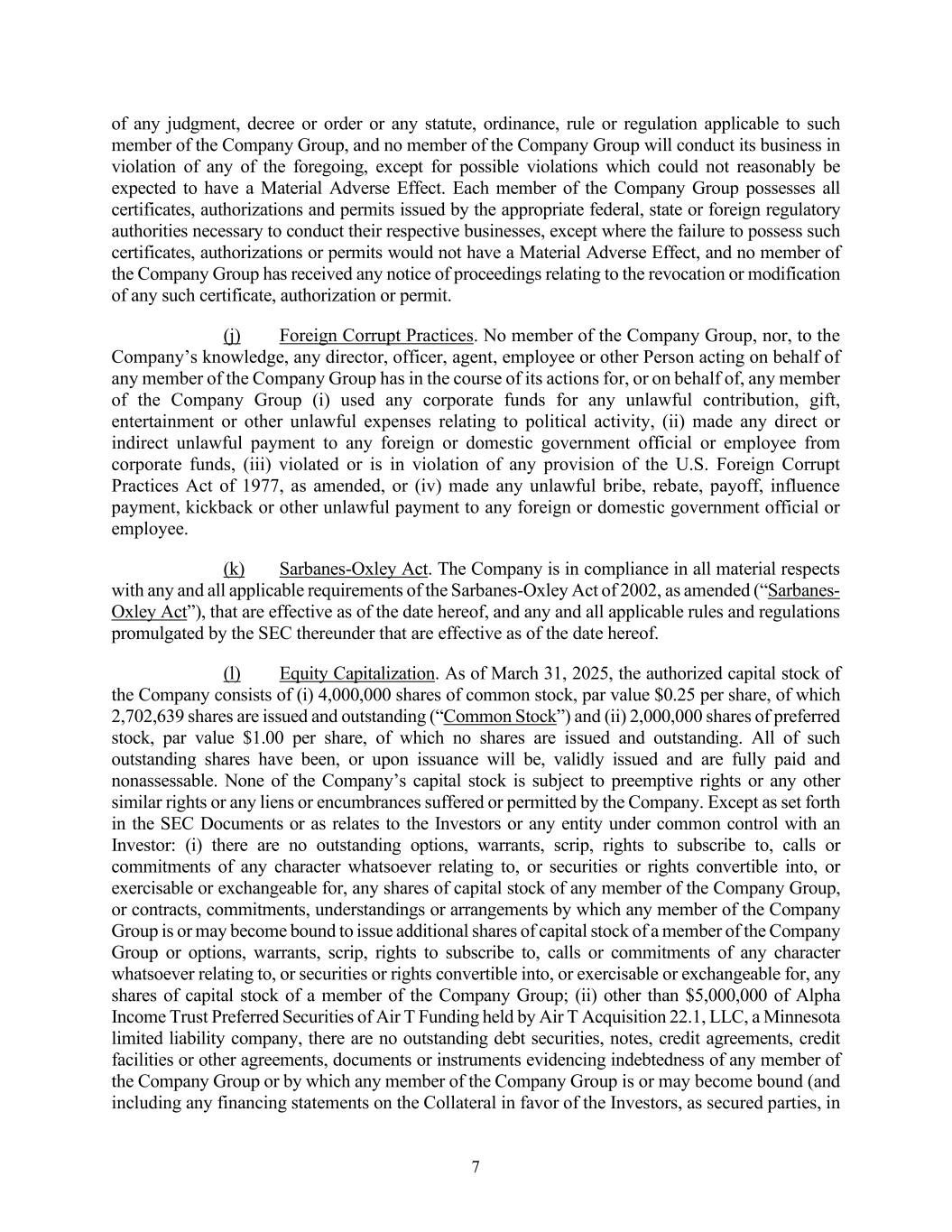 7 of any judgment, decree or order or any statute, ordinance, rule or regulation applicable to such member of the Company Group, and no member of the Company Group will conduct its business in violation of any of the foregoing, except for possible violations which could not reasonably be expected to have a Material Adverse Effect. Each member of the Company Group possesses all certificates, authorizations and permits issued by the appropriate federal, state or foreign regulatory authorities necessary to conduct their respective businesses, except where the failure to possess such certificates, authorizations or permits would not have a Material Adverse Effect, and no member of the Company Group has received any notice of proceedings relating to the revocation or modification of any such certificate, authorization or permit. (j) Foreign Corrupt Practices. No member of the Company Group, nor, to the Company’s knowledge, any director, officer, agent, employee or other Person acting on behalf of any member of the Company Group has in the course of its actions for, or on behalf of, any member of the Company Group (i) used any corporate funds for any unlawful contribution, gift, entertainment or other unlawful expenses relating to political activity, (ii) made any direct or indirect unlawful payment to any foreign or domestic government official or employee from corporate funds, (iii) violated or is in violation of any provision of the U.S. Foreign Corrupt Practices Act of 1977, as amended, or (iv) made any unlawful bribe, rebate, payoff, influence payment, kickback or other unlawful payment to any foreign or domestic government official or employee. (k) Sarbanes-Oxley Act. The Company is in compliance in all material respects with any and all applicable requirements of the Sarbanes-Oxley Act of 2002, as amended (“Sarbanes- Oxley Act”), that are effective as of the date hereof, and any and all applicable rules and regulations promulgated by the SEC thereunder that are effective as of the date hereof. (l) Equity Capitalization. As of March 31, 2025, the authorized capital stock of the Company consists of (i) 4,000,000 shares of common stock, par value $0.25 per share, of which 2,702,639 shares are issued and outstanding (“Common Stock”) and (ii) 2,000,000 shares of preferred stock, par value $1.00 per share, of which no shares are issued and outstanding. All of such outstanding shares have been, or upon issuance will be, validly issued and are fully paid and nonassessable. None of the Company’s capital stock is subject to preemptive rights or any other similar rights or any liens or encumbrances suffered or permitted by the Company. Except as set forth in the SEC Documents or as relates to the Investors or any entity under common control with an Investor: (i) there are no outstanding options, warrants, scrip, rights to subscribe to, calls or commitments of any character whatsoever relating to, or securities or rights convertible into, or exercisable or exchangeable for, any shares of capital stock of any member of the Company Group, or contracts, commitments, understandings or arrangements by which any member of the Company Group is or may become bound to issue additional shares of capital stock of a member of the Company Group or options, warrants, scrip, rights to subscribe to, calls or commitments of any character whatsoever relating to, or securities or rights convertible into, or exercisable or exchangeable for, any shares of capital stock of a member of the Company Group; (ii) other than $5,000,000 of Alpha Income Trust Preferred Securities of Air T Funding held by Air T Acquisition 22.1, LLC, a Minnesota limited liability company, there are no outstanding debt securities, notes, credit agreements, credit facilities or other agreements, documents or instruments evidencing indebtedness of any member of the Company Group or by which any member of the Company Group is or may become bound (and including any financing statements on the Collateral in favor of the Investors, as secured parties, in