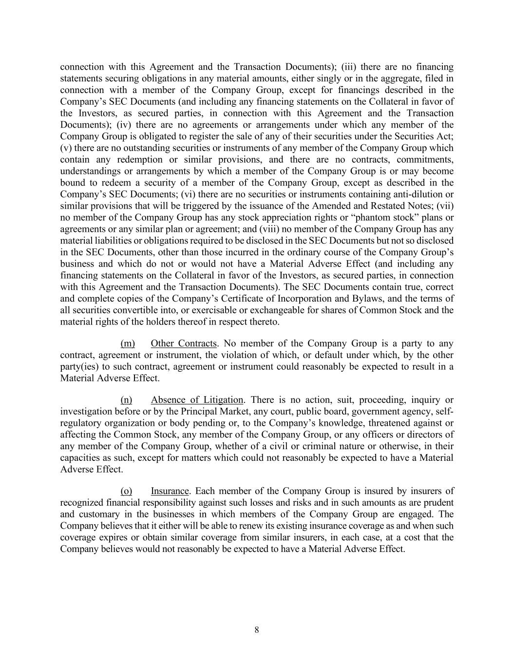 8 connection with this Agreement and the Transaction Documents); (iii) there are no financing statements securing obligations in any material amounts, either singly or in the aggregate, filed in connection with a member of the Company Group, except for financings described in the Company’s SEC Documents (and including any financing statements on the Collateral in favor of the Investors, as secured parties, in connection with this Agreement and the Transaction Documents); (iv) there are no agreements or arrangements under which any member of the Company Group is obligated to register the sale of any of their securities under the Securities Act; (v) there are no outstanding securities or instruments of any member of the Company Group which contain any redemption or similar provisions, and there are no contracts, commitments, understandings or arrangements by which a member of the Company Group is or may become bound to redeem a security of a member of the Company Group, except as described in the Company’s SEC Documents; (vi) there are no securities or instruments containing anti-dilution or similar provisions that will be triggered by the issuance of the Amended and Restated Notes; (vii) no member of the Company Group has any stock appreciation rights or “phantom stock” plans or agreements or any similar plan or agreement; and (viii) no member of the Company Group has any material liabilities or obligations required to be disclosed in the SEC Documents but not so disclosed in the SEC Documents, other than those incurred in the ordinary course of the Company Group’s business and which do not or would not have a Material Adverse Effect (and including any financing statements on the Collateral in favor of the Investors, as secured parties, in connection with this Agreement and the Transaction Documents). The SEC Documents contain true, correct and complete copies of the Company’s Certificate of Incorporation and Bylaws, and the terms of all securities convertible into, or exercisable or exchangeable for shares of Common Stock and the material rights of the holders thereof in respect thereto. (m) Other Contracts. No member of the Company Group is a party to any contract, agreement or instrument, the violation of which, or default under which, by the other party(ies) to such contract, agreement or instrument could reasonably be expected to result in a Material Adverse Effect. (n) Absence of Litigation. There is no action, suit, proceeding, inquiry or investigation before or by the Principal Market, any court, public board, government agency, self- regulatory organization or body pending or, to the Company’s knowledge, threatened against or affecting the Common Stock, any member of the Company Group, or any officers or directors of any member of the Company Group, whether of a civil or criminal nature or otherwise, in their capacities as such, except for matters which could not reasonably be expected to have a Material Adverse Effect. (o) Insurance. Each member of the Company Group is insured by insurers of recognized financial responsibility against such losses and risks and in such amounts as are prudent and customary in the businesses in which members of the Company Group are engaged. The Company believes that it either will be able to renew its existing insurance coverage as and when such coverage expires or obtain similar coverage from similar insurers, in each case, at a cost that the Company believes would not reasonably be expected to have a Material Adverse Effect.