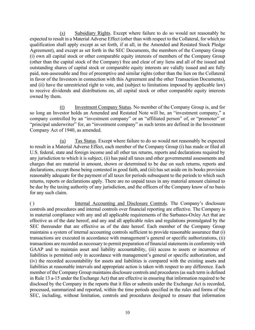 10 (s) Subsidiary Rights. Except where failure to do so would not reasonably be expected to result in a Material Adverse Effect (other than with respect to the Collateral, for which no qualification shall apply except as set forth, if at all, in the Amended and Restated Stock Pledge Agreement), and except as set forth in the SEC Documents, the members of the Company Group (i) own all capital stock or other comparable equity interests of members of the Company Group (other than the capital stock of the Company) free and clear of any liens and all of the issued and outstanding shares of capital stock or comparable equity interests are validly issued and are fully paid, non-assessable and free of preemptive and similar rights (other than the lien on the Collateral in favor of the Investors in connection with this Agreement and the other Transaction Documents), and (ii) have the unrestricted right to vote, and (subject to limitations imposed by applicable law) to receive dividends and distributions on, all capital stock or other comparable equity interests owned by them. (t) Investment Company Status. No member of the Company Group is, and for so long an Investor holds an Amended and Restated Note will be, an “investment company,” a company controlled by an “investment company” or an “affiliated person” of, or “promoter” or “principal underwriter” for, an “investment company” as such terms are defined in the Investment Company Act of 1940, as amended. (u) Tax Status. Except where failure to do so would not reasonably be expected to result in a Material Adverse Effect, each member of the Company Group (i) has made or filed all U.S. federal, state and foreign income and all other tax returns, reports and declarations required by any jurisdiction to which it is subject, (ii) has paid all taxes and other governmental assessments and charges that are material in amount, shown or determined to be due on such returns, reports and declarations, except those being contested in good faith, and (iii) has set aside on its books provision reasonably adequate for the payment of all taxes for periods subsequent to the periods to which such returns, reports or declarations apply. There are no unpaid taxes in any material amount claimed to be due by the taxing authority of any jurisdiction, and the officers of the Company know of no basis for any such claim. ( ) Internal Accounting and Disclosure Controls. The Company’s disclosure controls and procedures and internal controls over financial reporting are effective. The Company is in material compliance with any and all applicable requirements of the Sarbanes-Oxley Act that are effective as of the date hereof, and any and all applicable rules and regulations promulgated by the SEC thereunder that are effective as of the date hereof. Each member of the Company Group maintains a system of internal accounting controls sufficient to provide reasonable assurance that (i) transactions are executed in accordance with management’s general or specific authorizations, (ii) transactions are recorded as necessary to permit preparation of financial statements in conformity with GAAP and to maintain asset and liability accountability, (iii) access to assets or incurrence of liabilities is permitted only in accordance with management’s general or specific authorization, and (iv) the recorded accountability for assets and liabilities is compared with the existing assets and liabilities at reasonable intervals and appropriate action is taken with respect to any difference. Each member of the Company Group maintains disclosure controls and procedures (as such term is defined in Rule 13 a-15 under the Exchange Act) that are effective in ensuring that information required to be disclosed by the Company in the reports that it files or submits under the Exchange Act is recorded, processed, summarized and reported, within the time periods specified in the rules and forms of the SEC, including, without limitation, controls and procedures designed to ensure that information
