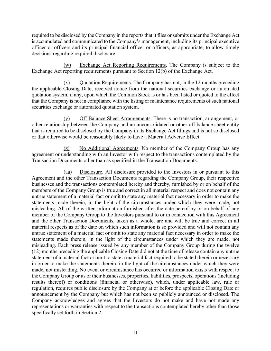11 required to be disclosed by the Company in the reports that it files or submits under the Exchange Act is accumulated and communicated to the Company’s management, including its principal executive officer or officers and its principal financial officer or officers, as appropriate, to allow timely decisions regarding required disclosure. (w) Exchange Act Reporting Requirements. The Company is subject to the Exchange Act reporting requirements pursuant to Section 12(b) of the Exchange Act. (x) Quotation Requirements. The Company has not, in the 12 months preceding the applicable Closing Date, received notice from the national securities exchange or automated quotation system, if any, upon which the Common Stock is or has been listed or quoted to the effect that the Company is not in compliance with the listing or maintenance requirements of such national securities exchange or automated quotation system. (y) Off Balance Sheet Arrangements. There is no transaction, arrangement, or other relationship between the Company and an unconsolidated or other off balance sheet entity that is required to be disclosed by the Company in its Exchange Act filings and is not so disclosed or that otherwise would be reasonably likely to have a Material Adverse Effect. (z) No Additional Agreements. No member of the Company Group has any agreement or understanding with an Investor with respect to the transactions contemplated by the Transaction Documents other than as specified in the Transaction Documents. (aa) Disclosure. All disclosure provided to the Investors in or pursuant to this Agreement and the other Transaction Documents regarding the Company Group, their respective businesses and the transactions contemplated hereby and thereby, furnished by or on behalf of the members of the Company Group is true and correct in all material respect and does not contain any untrue statement of a material fact or omit to state any material fact necessary in order to make the statements made therein, in the light of the circumstances under which they were made, not misleading. All of the written information furnished after the date hereof by or on behalf of any member of the Company Group to the Investors pursuant to or in connection with this Agreement and the other Transaction Documents, taken as a whole, are and will be true and correct in all material respects as of the date on which such information is so provided and will not contain any untrue statement of a material fact or omit to state any material fact necessary in order to make the statements made therein, in the light of the circumstances under which they are made, not misleading. Each press release issued by any member of the Company Group during the twelve (12) months preceding the applicable Closing Date did not at the time of release contain any untrue statement of a material fact or omit to state a material fact required to be stated therein or necessary in order to make the statements therein, in the light of the circumstances under which they were made, not misleading. No event or circumstance has occurred or information exists with respect to the Company Group or its or their businesses, properties, liabilities, prospects, operations (including results thereof) or conditions (financial or otherwise), which, under applicable law, rule or regulation, requires public disclosure by the Company at or before the applicable Closing Date or announcement by the Company but which has not been so publicly announced or disclosed. The Company acknowledges and agrees that the Investors do not make and have not made any representations or warranties with respect to the transactions contemplated hereby other than those specifically set forth in Section 2.
