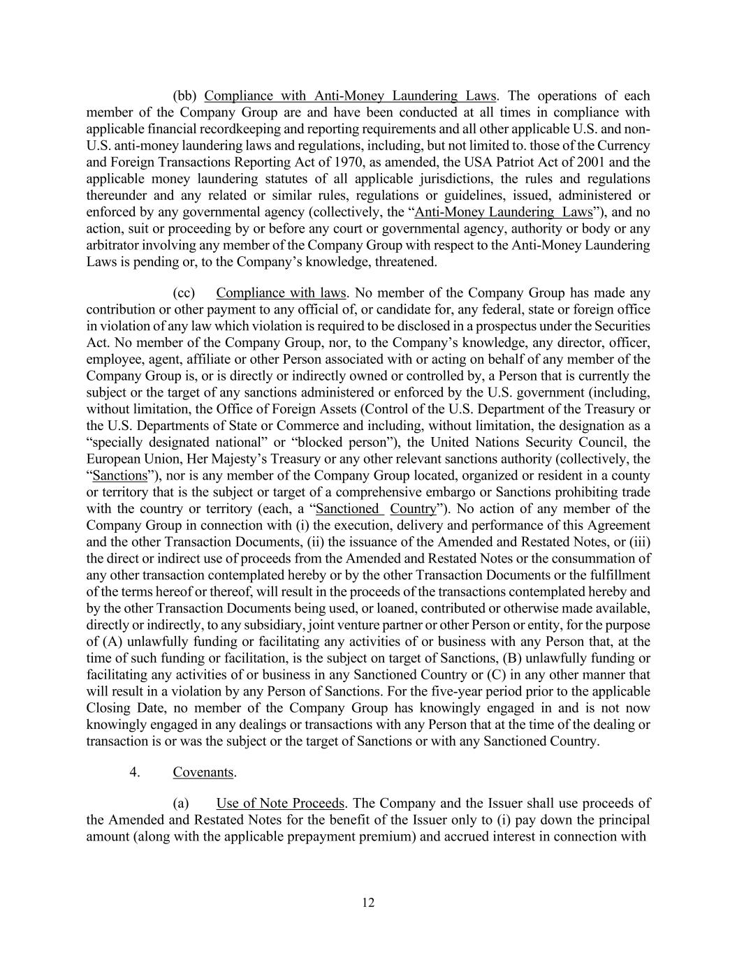 12 (bb) Compliance with Anti-Money Laundering Laws. The operations of each member of the Company Group are and have been conducted at all times in compliance with applicable financial recordkeeping and reporting requirements and all other applicable U.S. and non- U.S. anti-money laundering laws and regulations, including, but not limited to. those of the Currency and Foreign Transactions Reporting Act of 1970, as amended, the USA Patriot Act of 2001 and the applicable money laundering statutes of all applicable jurisdictions, the rules and regulations thereunder and any related or similar rules, regulations or guidelines, issued, administered or enforced by any governmental agency (collectively, the “Anti-Money Laundering Laws”), and no action, suit or proceeding by or before any court or governmental agency, authority or body or any arbitrator involving any member of the Company Group with respect to the Anti-Money Laundering Laws is pending or, to the Company’s knowledge, threatened. (cc) Compliance with laws. No member of the Company Group has made any contribution or other payment to any official of, or candidate for, any federal, state or foreign office in violation of any law which violation is required to be disclosed in a prospectus under the Securities Act. No member of the Company Group, nor, to the Company’s knowledge, any director, officer, employee, agent, affiliate or other Person associated with or acting on behalf of any member of the Company Group is, or is directly or indirectly owned or controlled by, a Person that is currently the subject or the target of any sanctions administered or enforced by the U.S. government (including, without limitation, the Office of Foreign Assets (Control of the U.S. Department of the Treasury or the U.S. Departments of State or Commerce and including, without limitation, the designation as a “specially designated national” or “blocked person”), the United Nations Security Council, the European Union, Her Majesty’s Treasury or any other relevant sanctions authority (collectively, the “Sanctions”), nor is any member of the Company Group located, organized or resident in a county or territory that is the subject or target of a comprehensive embargo or Sanctions prohibiting trade with the country or territory (each, a “Sanctioned Country”). No action of any member of the Company Group in connection with (i) the execution, delivery and performance of this Agreement and the other Transaction Documents, (ii) the issuance of the Amended and Restated Notes, or (iii) the direct or indirect use of proceeds from the Amended and Restated Notes or the consummation of any other transaction contemplated hereby or by the other Transaction Documents or the fulfillment of the terms hereof or thereof, will result in the proceeds of the transactions contemplated hereby and by the other Transaction Documents being used, or loaned, contributed or otherwise made available, directly or indirectly, to any subsidiary, joint venture partner or other Person or entity, for the purpose of (A) unlawfully funding or facilitating any activities of or business with any Person that, at the time of such funding or facilitation, is the subject on target of Sanctions, (B) unlawfully funding or facilitating any activities of or business in any Sanctioned Country or (C) in any other manner that will result in a violation by any Person of Sanctions. For the five-year period prior to the applicable Closing Date, no member of the Company Group has knowingly engaged in and is not now knowingly engaged in any dealings or transactions with any Person that at the time of the dealing or transaction is or was the subject or the target of Sanctions or with any Sanctioned Country. 4. Covenants. (a) Use of Note Proceeds. The Company and the Issuer shall use proceeds of the Amended and Restated Notes for the benefit of the Issuer only to (i) pay down the principal amount (along with the applicable prepayment premium) and accrued interest in connection with