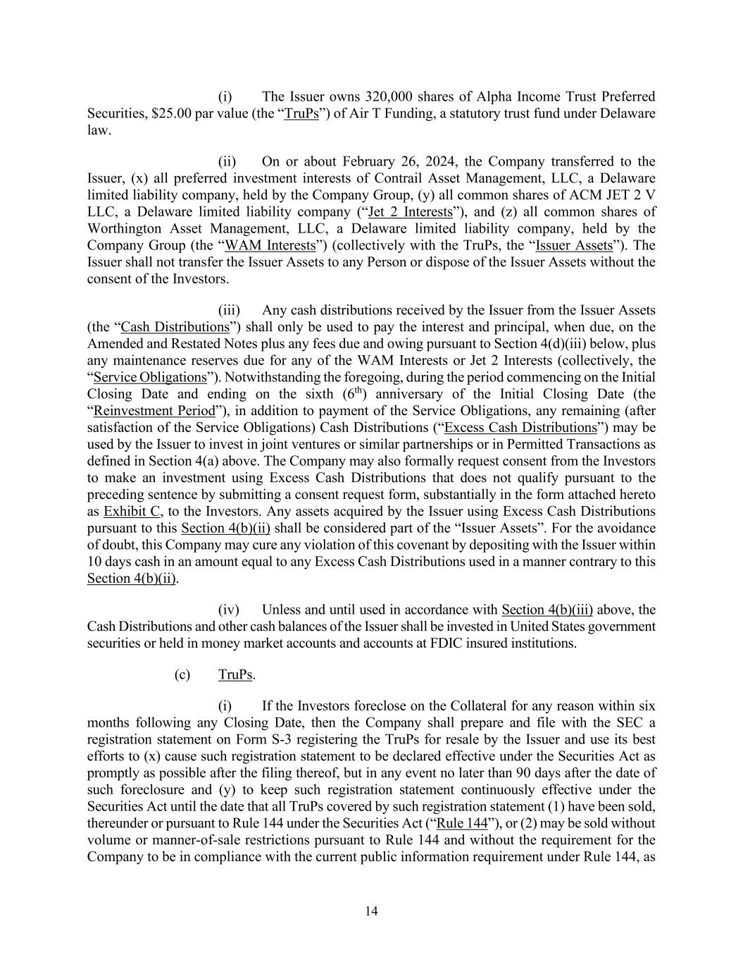14 (i) The Issuer owns 320,000 shares of Alpha Income Trust Preferred Securities, $25.00 par value (the “TruPs”) of Air T Funding, a statutory trust fund under Delaware law. (ii) On or about February 26, 2024, the Company transferred to the Issuer, (x) all preferred investment interests of Contrail Asset Management, LLC, a Delaware limited liability company, held by the Company Group, (y) all common shares of ACM JET 2 V LLC, a Delaware limited liability company (“Jet 2 Interests”), and (z) all common shares of Worthington Asset Management, LLC, a Delaware limited liability company, held by the Company Group (the “WAM Interests”) (collectively with the TruPs, the “Issuer Assets”). The Issuer shall not transfer the Issuer Assets to any Person or dispose of the Issuer Assets without the consent of the Investors. (iii) Any cash distributions received by the Issuer from the Issuer Assets (the “Cash Distributions”) shall only be used to pay the interest and principal, when due, on the Amended and Restated Notes plus any fees due and owing pursuant to Section 4(d)(iii) below, plus any maintenance reserves due for any of the WAM Interests or Jet 2 Interests (collectively, the “Service Obligations”). Notwithstanding the foregoing, during the period commencing on the Initial Closing Date and ending on the sixth (6th) anniversary of the Initial Closing Date (the “Reinvestment Period”), in addition to payment of the Service Obligations, any remaining (after satisfaction of the Service Obligations) Cash Distributions (“Excess Cash Distributions”) may be used by the Issuer to invest in joint ventures or similar partnerships or in Permitted Transactions as defined in Section 4(a) above. The Company may also formally request consent from the Investors to make an investment using Excess Cash Distributions that does not qualify pursuant to the preceding sentence by submitting a consent request form, substantially in the form attached hereto as Exhibit C, to the Investors. Any assets acquired by the Issuer using Excess Cash Distributions pursuant to this Section 4(b)(ii) shall be considered part of the “Issuer Assets”. For the avoidance of doubt, this Company may cure any violation of this covenant by depositing with the Issuer within 10 days cash in an amount equal to any Excess Cash Distributions used in a manner contrary to this Section 4(b)(ii). (iv) Unless and until used in accordance with Section 4(b)(iii) above, the Cash Distributions and other cash balances of the Issuer shall be invested in United States government securities or held in money market accounts and accounts at FDIC insured institutions. (c) TruPs. (i) If the Investors foreclose on the Collateral for any reason within six months following any Closing Date, then the Company shall prepare and file with the SEC a registration statement on Form S-3 registering the TruPs for resale by the Issuer and use its best efforts to (x) cause such registration statement to be declared effective under the Securities Act as promptly as possible after the filing thereof, but in any event no later than 90 days after the date of such foreclosure and (y) to keep such registration statement continuously effective under the Securities Act until the date that all TruPs covered by such registration statement (1) have been sold, thereunder or pursuant to Rule 144 under the Securities Act (“Rule 144”), or (2) may be sold without volume or manner-of-sale restrictions pursuant to Rule 144 and without the requirement for the Company to be in compliance with the current public information requirement under Rule 144, as