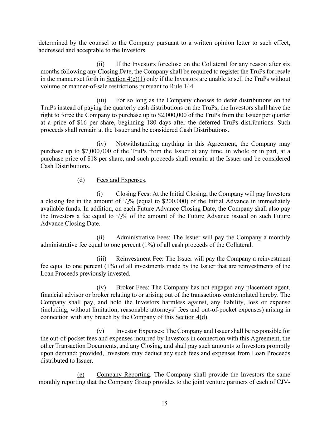 15 determined by the counsel to the Company pursuant to a written opinion letter to such effect, addressed and acceptable to the Investors. (ii) If the Investors foreclose on the Collateral for any reason after six months following any Closing Date, the Company shall be required to register the TruPs for resale in the manner set forth in Section 4(c)(1) only if the Investors are unable to sell the TruPs without volume or manner-of-sale restrictions pursuant to Rule 144. (iii) For so long as the Company chooses to defer distributions on the TruPs instead of paying the quarterly cash distributions on the TruPs, the Investors shall have the right to force the Company to purchase up to $2,000,000 of the TruPs from the Issuer per quarter at a price of $16 per share, beginning 180 days after the deferred TruPs distributions. Such proceeds shall remain at the Issuer and be considered Cash Distributions. (iv) Notwithstanding anything in this Agreement, the Company may purchase up to $7,000,000 of the TruPs from the Issuer at any time, in whole or in part, at a purchase price of $18 per share, and such proceeds shall remain at the Issuer and be considered Cash Distributions. (d) Fees and Expenses. (i) Closing Fees: At the Initial Closing, the Company will pay Investors a closing fee in the amount of 1/2% (equal to $200,000) of the Initial Advance in immediately available funds. In addition, on each Future Advance Closing Date, the Company shall also pay the Investors a fee equal to 1/2% of the amount of the Future Advance issued on such Future Advance Closing Date. (ii) Administrative Fees: The Issuer will pay the Company a monthly administrative fee equal to one percent (1%) of all cash proceeds of the Collateral. (iii) Reinvestment Fee: The Issuer will pay the Company a reinvestment fee equal to one percent (1%) of all investments made by the Issuer that are reinvestments of the Loan Proceeds previously invested. (iv) Broker Fees: The Company has not engaged any placement agent, financial advisor or broker relating to or arising out of the transactions contemplated hereby. The Company shall pay, and hold the Investors harmless against, any liability, loss or expense (including, without limitation, reasonable attorneys’ fees and out-of-pocket expenses) arising in connection with any breach by the Company of this Section 4(d). (v) Investor Expenses: The Company and Issuer shall be responsible for the out-of-pocket fees and expenses incurred by Investors in connection with this Agreement, the other Transaction Documents, and any Closing, and shall pay such amounts to Investors promptly upon demand; provided, Investors may deduct any such fees and expenses from Loan Proceeds distributed to Issuer. (e) Company Reporting. The Company shall provide the Investors the same monthly reporting that the Company Group provides to the joint venture partners of each of CJV-