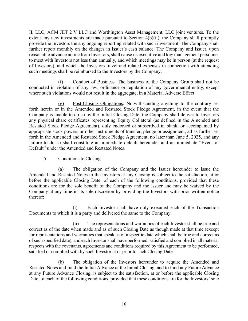 16 II, LLC, ACM JET 2 V LLC and Worthington Asset Management, LLC joint ventures. To the extent any new investments are made pursuant to Section 4(b)(ii), the Company shall promptly provide the Investors the any ongoing reporting related with such investment. The Company shall further report monthly on the changes in Issuer’s cash balance. The Company and Issuer, upon reasonable advance notice from Investors, shall cause its executive and key management personnel to meet with Investors not less than annually, and which meetings may be in person (at the request of Investors), and which the Investors travel and related expenses in connection with attending such meetings shall be reimbursed to the Investors by the Company. (f) Conduct of Business. The business of the Company Group shall not be conducted in violation of any law, ordinance or regulation of any governmental entity, except where such violations would not result in the aggregate, in a Material Adverse Effect. (g) Post-Closing Obligations. Notwithstanding anything to the contrary set forth herein or in the Amended and Restated Stock Pledge Agreement, in the event that the Company is unable to do so by the Initial Closing Date, the Company shall deliver to Investors any physical share certificates representing Equity Collateral (as defined in the Amended and Restated Stock Pledge Agreement), duly endorsed or subscribed in blank, or accompanied by appropriate stock powers or other instruments of transfer, pledge or assignment, all as further set forth in the Amended and Restated Stock Pledge Agreement, no later than June 5, 2025, and any failure to do so shall constitute an immediate default hereunder and an immediate “Event of Default” under the Amended and Restated Notes. 5. Conditions to Closing. (a) The obligation of the Company and the Issuer hereunder to issue the Amended and Restated Notes to the Investors at any Closing is subject to the satisfaction, at or before the applicable Closing Date, of each of the following conditions, provided that these conditions are for the sole benefit of the Company and the Issuer and may be waived by the Company at any time in its sole discretion by providing the Investors with prior written notice thereof: (i) Each Investor shall have duly executed each of the Transaction Documents to which it is a party and delivered the same to the Company. (ii) The representations and warranties of each Investor shall be true and correct as of the date when made and as of such Closing Date as though made at that time (except for representations and warranties that speak as of a specific date which shall be true and correct as of such specified date), and each Investor shall have performed, satisfied and complied in all material respects with the covenants, agreements and conditions required by this Agreement to be performed, satisfied or complied with by such Investor at or prior to such Closing Date. (b) The obligation of the Investors hereunder to acquire the Amended and Restated Notes and fund the Initial Advance at the Initial Closing, and to fund any Future Advance at any Future Advance Closing, is subject to the satisfaction, at or before the applicable Closing Date, of each of the following conditions, provided that these conditions are for the Investors’ sole