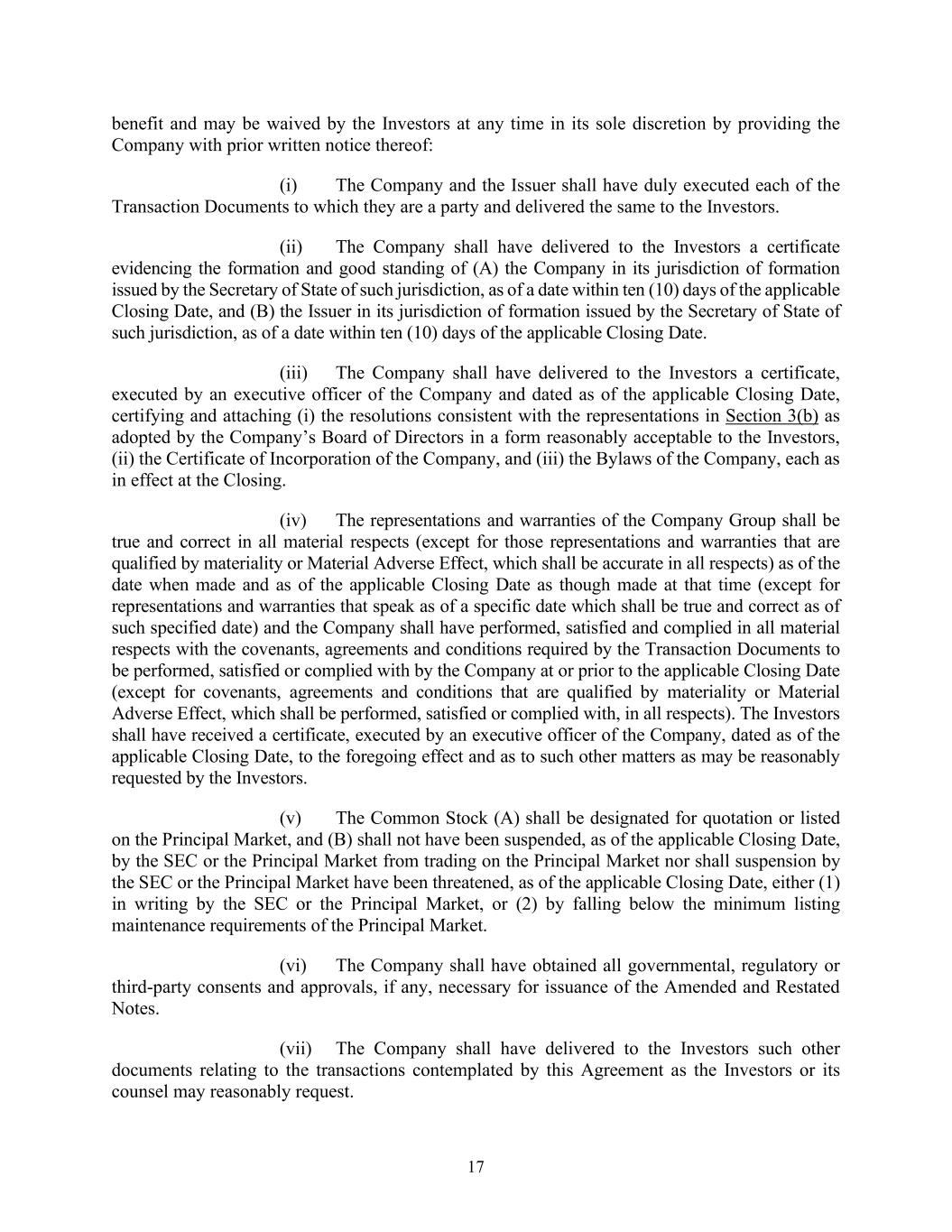 17 benefit and may be waived by the Investors at any time in its sole discretion by providing the Company with prior written notice thereof: (i) The Company and the Issuer shall have duly executed each of the Transaction Documents to which they are a party and delivered the same to the Investors. (ii) The Company shall have delivered to the Investors a certificate evidencing the formation and good standing of (A) the Company in its jurisdiction of formation issued by the Secretary of State of such jurisdiction, as of a date within ten (10) days of the applicable Closing Date, and (B) the Issuer in its jurisdiction of formation issued by the Secretary of State of such jurisdiction, as of a date within ten (10) days of the applicable Closing Date. (iii) The Company shall have delivered to the Investors a certificate, executed by an executive officer of the Company and dated as of the applicable Closing Date, certifying and attaching (i) the resolutions consistent with the representations in Section 3(b) as adopted by the Company’s Board of Directors in a form reasonably acceptable to the Investors, (ii) the Certificate of Incorporation of the Company, and (iii) the Bylaws of the Company, each as in effect at the Closing. (iv) The representations and warranties of the Company Group shall be true and correct in all material respects (except for those representations and warranties that are qualified by materiality or Material Adverse Effect, which shall be accurate in all respects) as of the date when made and as of the applicable Closing Date as though made at that time (except for representations and warranties that speak as of a specific date which shall be true and correct as of such specified date) and the Company shall have performed, satisfied and complied in all material respects with the covenants, agreements and conditions required by the Transaction Documents to be performed, satisfied or complied with by the Company at or prior to the applicable Closing Date (except for covenants, agreements and conditions that are qualified by materiality or Material Adverse Effect, which shall be performed, satisfied or complied with, in all respects). The Investors shall have received a certificate, executed by an executive officer of the Company, dated as of the applicable Closing Date, to the foregoing effect and as to such other matters as may be reasonably requested by the Investors. (v) The Common Stock (A) shall be designated for quotation or listed on the Principal Market, and (B) shall not have been suspended, as of the applicable Closing Date, by the SEC or the Principal Market from trading on the Principal Market nor shall suspension by the SEC or the Principal Market have been threatened, as of the applicable Closing Date, either (1) in writing by the SEC or the Principal Market, or (2) by falling below the minimum listing maintenance requirements of the Principal Market. (vi) The Company shall have obtained all governmental, regulatory or third-party consents and approvals, if any, necessary for issuance of the Amended and Restated Notes. (vii) The Company shall have delivered to the Investors such other documents relating to the transactions contemplated by this Agreement as the Investors or its counsel may reasonably request.