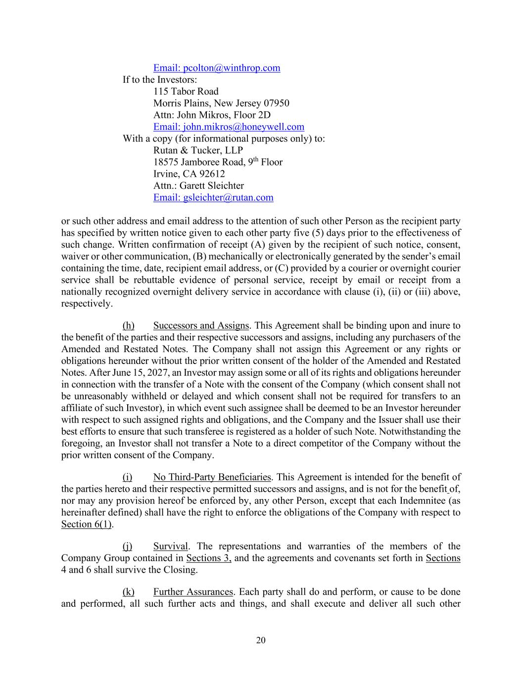 20 Email: pcolton@winthrop.com If to the Investors: 115 Tabor Road Morris Plains, New Jersey 07950 Attn: John Mikros, Floor 2D Email: john.mikros@honeywell.com With a copy (for informational purposes only) to: Rutan & Tucker, LLP 18575 Jamboree Road, 9th Floor Irvine, CA 92612 Attn.: Garett Sleichter Email: gsleichter@rutan.com or such other address and email address to the attention of such other Person as the recipient party has specified by written notice given to each other party five (5) days prior to the effectiveness of such change. Written confirmation of receipt (A) given by the recipient of such notice, consent, waiver or other communication, (B) mechanically or electronically generated by the sender’s email containing the time, date, recipient email address, or (C) provided by a courier or overnight courier service shall be rebuttable evidence of personal service, receipt by email or receipt from a nationally recognized overnight delivery service in accordance with clause (i), (ii) or (iii) above, respectively. (h) Successors and Assigns. This Agreement shall be binding upon and inure to the benefit of the parties and their respective successors and assigns, including any purchasers of the Amended and Restated Notes. The Company shall not assign this Agreement or any rights or obligations hereunder without the prior written consent of the holder of the Amended and Restated Notes. After June 15, 2027, an Investor may assign some or all of its rights and obligations hereunder in connection with the transfer of a Note with the consent of the Company (which consent shall not be unreasonably withheld or delayed and which consent shall not be required for transfers to an affiliate of such Investor), in which event such assignee shall be deemed to be an Investor hereunder with respect to such assigned rights and obligations, and the Company and the Issuer shall use their best efforts to ensure that such transferee is registered as a holder of such Note. Notwithstanding the foregoing, an Investor shall not transfer a Note to a direct competitor of the Company without the prior written consent of the Company. (i) No Third-Party Beneficiaries. This Agreement is intended for the benefit of the parties hereto and their respective permitted successors and assigns, and is not for the benefit of, nor may any provision hereof be enforced by, any other Person, except that each Indemnitee (as hereinafter defined) shall have the right to enforce the obligations of the Company with respect to Section 6(1). (j) Survival. The representations and warranties of the members of the Company Group contained in Sections 3, and the agreements and covenants set forth in Sections 4 and 6 shall survive the Closing. (k) Further Assurances. Each party shall do and perform, or cause to be done and performed, all such further acts and things, and shall execute and deliver all such other