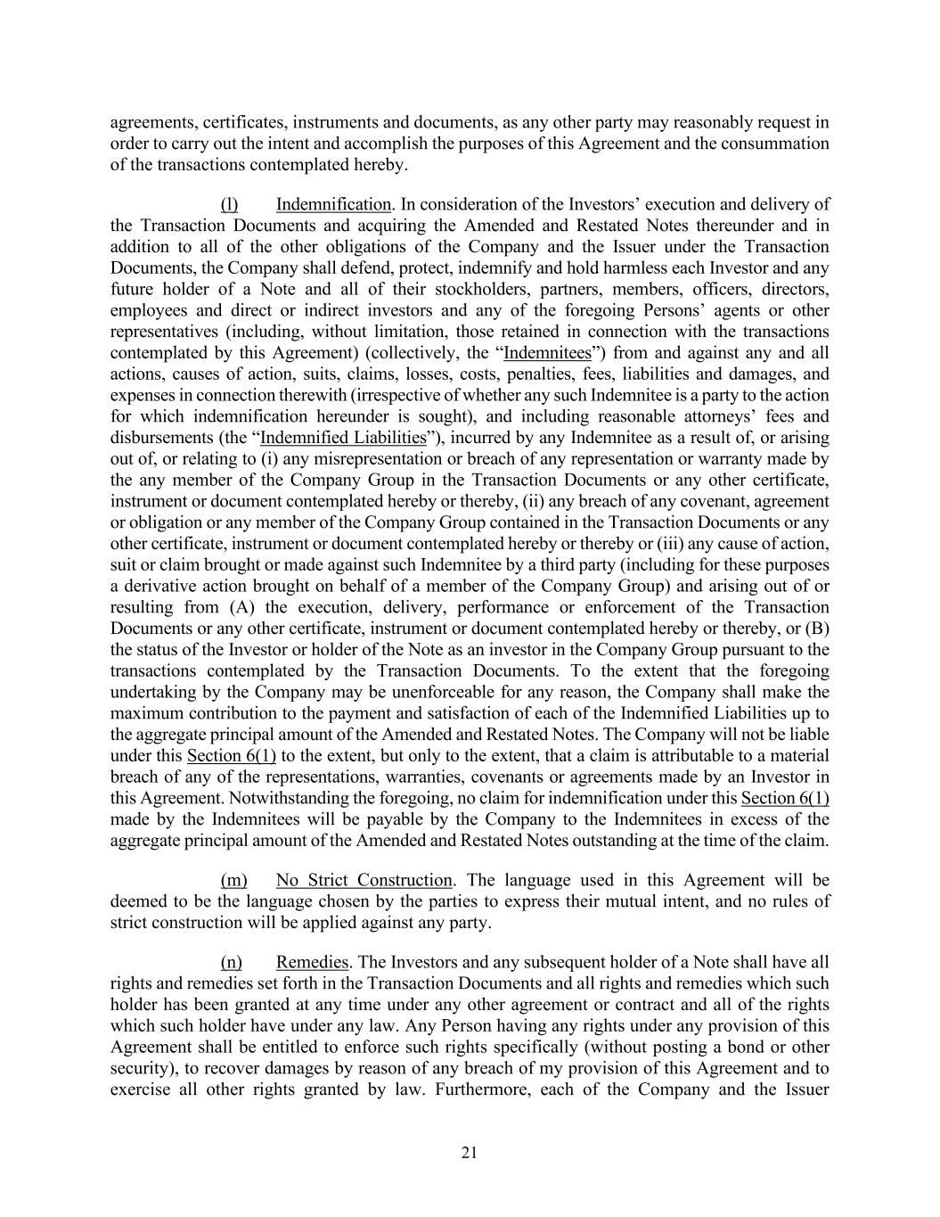 21 agreements, certificates, instruments and documents, as any other party may reasonably request in order to carry out the intent and accomplish the purposes of this Agreement and the consummation of the transactions contemplated hereby. (l) Indemnification. In consideration of the Investors’ execution and delivery of the Transaction Documents and acquiring the Amended and Restated Notes thereunder and in addition to all of the other obligations of the Company and the Issuer under the Transaction Documents, the Company shall defend, protect, indemnify and hold harmless each Investor and any future holder of a Note and all of their stockholders, partners, members, officers, directors, employees and direct or indirect investors and any of the foregoing Persons’ agents or other representatives (including, without limitation, those retained in connection with the transactions contemplated by this Agreement) (collectively, the “Indemnitees”) from and against any and all actions, causes of action, suits, claims, losses, costs, penalties, fees, liabilities and damages, and expenses in connection therewith (irrespective of whether any such Indemnitee is a party to the action for which indemnification hereunder is sought), and including reasonable attorneys’ fees and disbursements (the “Indemnified Liabilities”), incurred by any Indemnitee as a result of, or arising out of, or relating to (i) any misrepresentation or breach of any representation or warranty made by the any member of the Company Group in the Transaction Documents or any other certificate, instrument or document contemplated hereby or thereby, (ii) any breach of any covenant, agreement or obligation or any member of the Company Group contained in the Transaction Documents or any other certificate, instrument or document contemplated hereby or thereby or (iii) any cause of action, suit or claim brought or made against such Indemnitee by a third party (including for these purposes a derivative action brought on behalf of a member of the Company Group) and arising out of or resulting from (A) the execution, delivery, performance or enforcement of the Transaction Documents or any other certificate, instrument or document contemplated hereby or thereby, or (B) the status of the Investor or holder of the Note as an investor in the Company Group pursuant to the transactions contemplated by the Transaction Documents. To the extent that the foregoing undertaking by the Company may be unenforceable for any reason, the Company shall make the maximum contribution to the payment and satisfaction of each of the Indemnified Liabilities up to the aggregate principal amount of the Amended and Restated Notes. The Company will not be liable under this Section 6(1) to the extent, but only to the extent, that a claim is attributable to a material breach of any of the representations, warranties, covenants or agreements made by an Investor in this Agreement. Notwithstanding the foregoing, no claim for indemnification under this Section 6(1) made by the Indemnitees will be payable by the Company to the Indemnitees in excess of the aggregate principal amount of the Amended and Restated Notes outstanding at the time of the claim. (m) No Strict Construction. The language used in this Agreement will be deemed to be the language chosen by the parties to express their mutual intent, and no rules of strict construction will be applied against any party. (n) Remedies. The Investors and any subsequent holder of a Note shall have all rights and remedies set forth in the Transaction Documents and all rights and remedies which such holder has been granted at any time under any other agreement or contract and all of the rights which such holder have under any law. Any Person having any rights under any provision of this Agreement shall be entitled to enforce such rights specifically (without posting a bond or other security), to recover damages by reason of any breach of my provision of this Agreement and to exercise all other rights granted by law. Furthermore, each of the Company and the Issuer
