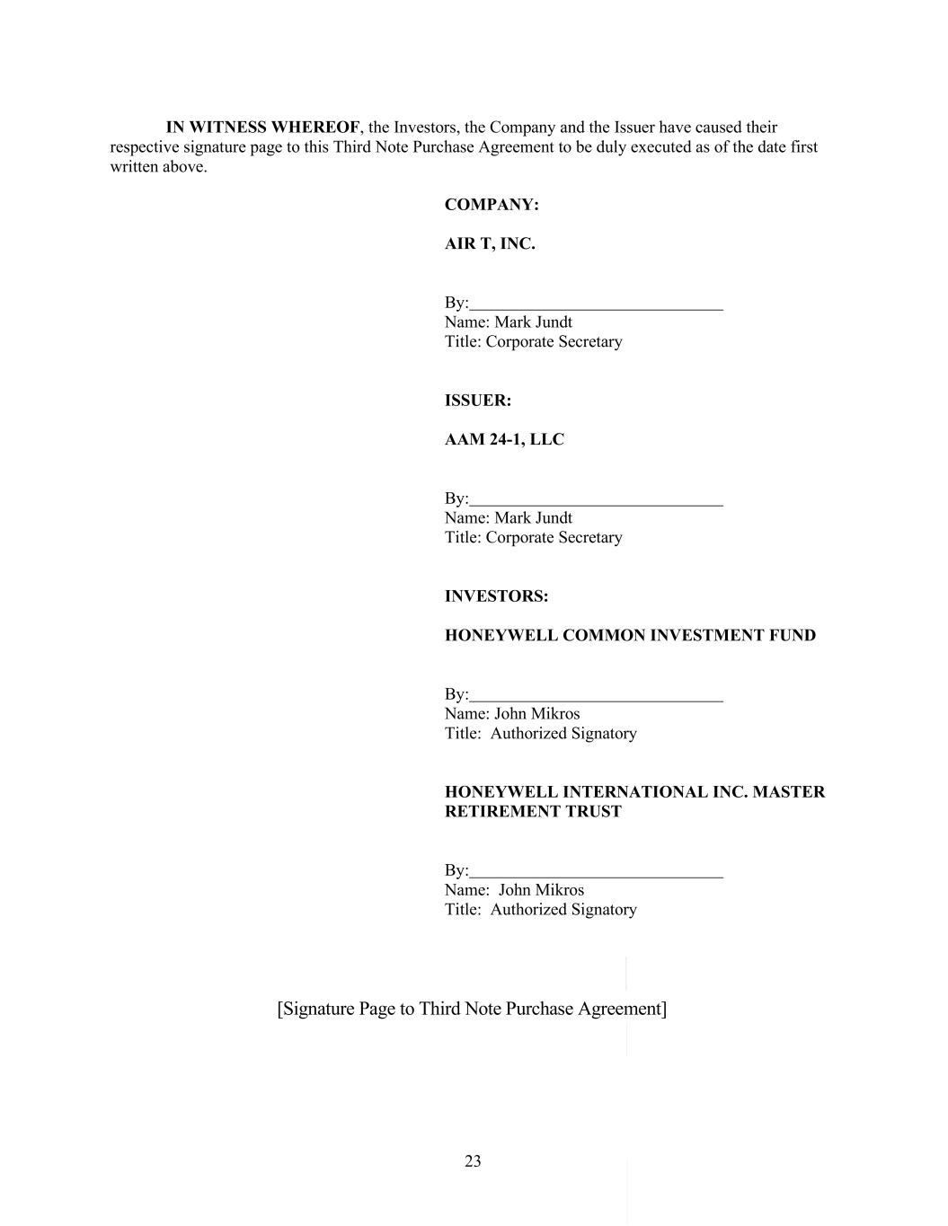 23 IN WITNESS WHEREOF, the Investors, the Company and the Issuer have caused their respective signature page to this Third Note Purchase Agreement to be duly executed as of the date first written above. COMPANY: AIR T, INC. By: Name: Mark Jundt Title: Corporate Secretary ISSUER: AAM 24-1, LLC By: Name: Mark Jundt Title: Corporate Secretary INVESTORS: HONEYWELL COMMON INVESTMENT FUND By: Name: John Mikros Title: Authorized Signatory HONEYWELL INTERNATIONAL INC. MASTER RETIREMENT TRUST By: Name: John Mikros Title: Authorized Signatory [Signature Page to Third Note Purchase Agreement]