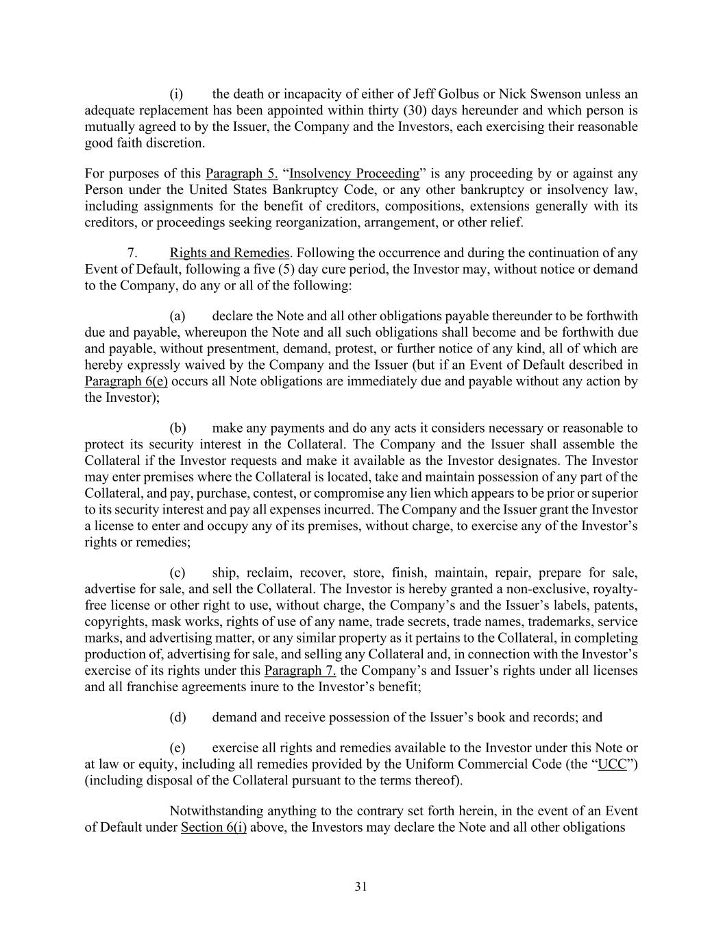 31 (i) the death or incapacity of either of Jeff Golbus or Nick Swenson unless an adequate replacement has been appointed within thirty (30) days hereunder and which person is mutually agreed to by the Issuer, the Company and the Investors, each exercising their reasonable good faith discretion. For purposes of this Paragraph 5. “Insolvency Proceeding” is any proceeding by or against any Person under the United States Bankruptcy Code, or any other bankruptcy or insolvency law, including assignments for the benefit of creditors, compositions, extensions generally with its creditors, or proceedings seeking reorganization, arrangement, or other relief. 7. Rights and Remedies. Following the occurrence and during the continuation of any Event of Default, following a five (5) day cure period, the Investor may, without notice or demand to the Company, do any or all of the following: (a) declare the Note and all other obligations payable thereunder to be forthwith due and payable, whereupon the Note and all such obligations shall become and be forthwith due and payable, without presentment, demand, protest, or further notice of any kind, all of which are hereby expressly waived by the Company and the Issuer (but if an Event of Default described in Paragraph 6(e) occurs all Note obligations are immediately due and payable without any action by the Investor); (b) make any payments and do any acts it considers necessary or reasonable to protect its security interest in the Collateral. The Company and the Issuer shall assemble the Collateral if the Investor requests and make it available as the Investor designates. The Investor may enter premises where the Collateral is located, take and maintain possession of any part of the Collateral, and pay, purchase, contest, or compromise any lien which appears to be prior or superior to its security interest and pay all expenses incurred. The Company and the Issuer grant the Investor a license to enter and occupy any of its premises, without charge, to exercise any of the Investor’s rights or remedies; (c) ship, reclaim, recover, store, finish, maintain, repair, prepare for sale, advertise for sale, and sell the Collateral. The Investor is hereby granted a non-exclusive, royalty- free license or other right to use, without charge, the Company’s and the Issuer’s labels, patents, copyrights, mask works, rights of use of any name, trade secrets, trade names, trademarks, service marks, and advertising matter, or any similar property as it pertains to the Collateral, in completing production of, advertising for sale, and selling any Collateral and, in connection with the Investor’s exercise of its rights under this Paragraph 7. the Company’s and Issuer’s rights under all licenses and all franchise agreements inure to the Investor’s benefit; (d) demand and receive possession of the Issuer’s book and records; and (e) exercise all rights and remedies available to the Investor under this Note or at law or equity, including all remedies provided by the Uniform Commercial Code (the “UCC”) (including disposal of the Collateral pursuant to the terms thereof). Notwithstanding anything to the contrary set forth herein, in the event of an Event of Default under Section 6(i) above, the Investors may declare the Note and all other obligations