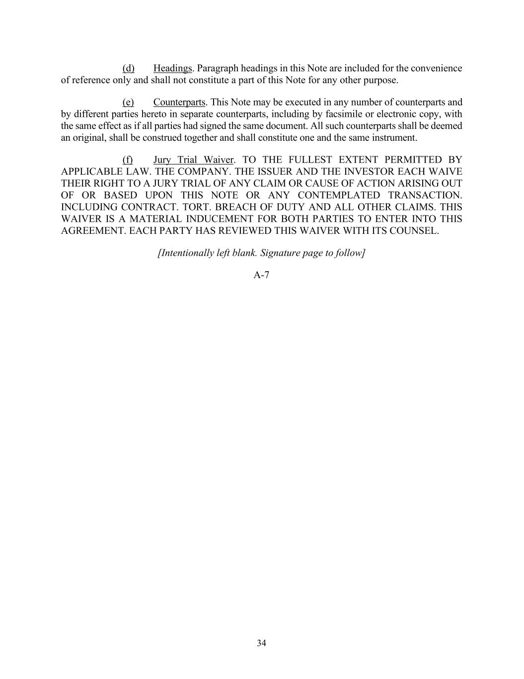34 (d) Headings. Paragraph headings in this Note are included for the convenience of reference only and shall not constitute a part of this Note for any other purpose. (e) Counterparts. This Note may be executed in any number of counterparts and by different parties hereto in separate counterparts, including by facsimile or electronic copy, with the same effect as if all parties had signed the same document. All such counterparts shall be deemed an original, shall be construed together and shall constitute one and the same instrument. (f) Jury Trial Waiver. TO THE FULLEST EXTENT PERMITTED BY APPLICABLE LAW. THE COMPANY. THE ISSUER AND THE INVESTOR EACH WAIVE THEIR RIGHT TO A JURY TRIAL OF ANY CLAIM OR CAUSE OF ACTION ARISING OUT OF OR BASED UPON THIS NOTE OR ANY CONTEMPLATED TRANSACTION. INCLUDING CONTRACT. TORT. BREACH OF DUTY AND ALL OTHER CLAIMS. THIS WAIVER IS A MATERIAL INDUCEMENT FOR BOTH PARTIES TO ENTER INTO THIS AGREEMENT. EACH PARTY HAS REVIEWED THIS WAIVER WITH ITS COUNSEL. [Intentionally left blank. Signature page to follow] A-7
