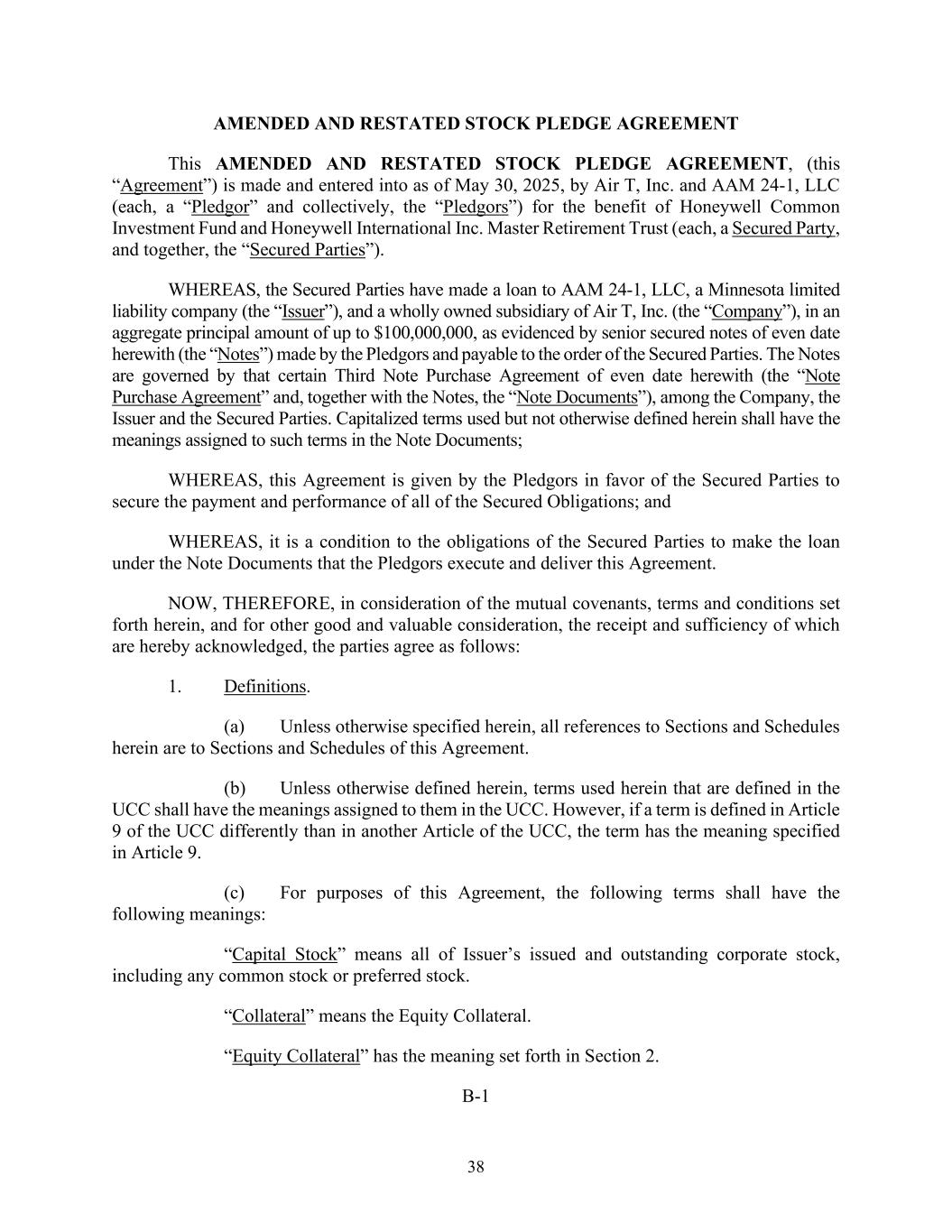 38 AMENDED AND RESTATED STOCK PLEDGE AGREEMENT This AMENDED AND RESTATED STOCK PLEDGE AGREEMENT, (this “Agreement”) is made and entered into as of May 30, 2025, by Air T, Inc. and AAM 24-1, LLC (each, a “Pledgor” and collectively, the “Pledgors”) for the benefit of Honeywell Common Investment Fund and Honeywell International Inc. Master Retirement Trust (each, a Secured Party, and together, the “Secured Parties”). WHEREAS, the Secured Parties have made a loan to AAM 24-1, LLC, a Minnesota limited liability company (the “Issuer”), and a wholly owned subsidiary of Air T, Inc. (the “Company”), in an aggregate principal amount of up to $100,000,000, as evidenced by senior secured notes of even date herewith (the “Notes”) made by the Pledgors and payable to the order of the Secured Parties. The Notes are governed by that certain Third Note Purchase Agreement of even date herewith (the “Note Purchase Agreement” and, together with the Notes, the “Note Documents”), among the Company, the Issuer and the Secured Parties. Capitalized terms used but not otherwise defined herein shall have the meanings assigned to such terms in the Note Documents; WHEREAS, this Agreement is given by the Pledgors in favor of the Secured Parties to secure the payment and performance of all of the Secured Obligations; and WHEREAS, it is a condition to the obligations of the Secured Parties to make the loan under the Note Documents that the Pledgors execute and deliver this Agreement. NOW, THEREFORE, in consideration of the mutual covenants, terms and conditions set forth herein, and for other good and valuable consideration, the receipt and sufficiency of which are hereby acknowledged, the parties agree as follows: 1. Definitions. (a) Unless otherwise specified herein, all references to Sections and Schedules herein are to Sections and Schedules of this Agreement. (b) Unless otherwise defined herein, terms used herein that are defined in the UCC shall have the meanings assigned to them in the UCC. However, if a term is defined in Article 9 of the UCC differently than in another Article of the UCC, the term has the meaning specified in Article 9. (c) For purposes of this Agreement, the following terms shall have the following meanings: “Capital Stock” means all of Issuer’s issued and outstanding corporate stock, including any common stock or preferred stock. “Collateral” means the Equity Collateral. “Equity Collateral” has the meaning set forth in Section 2. B-1