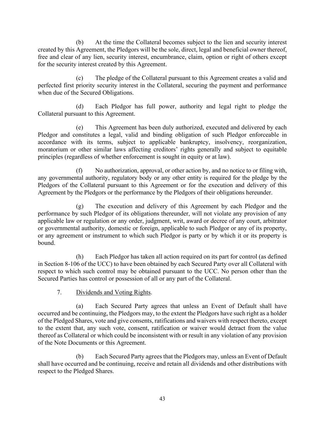 43 (b) At the time the Collateral becomes subject to the lien and security interest created by this Agreement, the Pledgors will be the sole, direct, legal and beneficial owner thereof, free and clear of any lien, security interest, encumbrance, claim, option or right of others except for the security interest created by this Agreement. (c) The pledge of the Collateral pursuant to this Agreement creates a valid and perfected first priority security interest in the Collateral, securing the payment and performance when due of the Secured Obligations. (d) Each Pledgor has full power, authority and legal right to pledge the Collateral pursuant to this Agreement. (e) This Agreement has been duly authorized, executed and delivered by each Pledgor and constitutes a legal, valid and binding obligation of such Pledgor enforceable in accordance with its terms, subject to applicable bankruptcy, insolvency, reorganization, moratorium or other similar laws affecting creditors’ rights generally and subject to equitable principles (regardless of whether enforcement is sought in equity or at law). (f) No authorization, approval, or other action by, and no notice to or filing with, any governmental authority, regulatory body or any other entity is required for the pledge by the Pledgors of the Collateral pursuant to this Agreement or for the execution and delivery of this Agreement by the Pledgors or the performance by the Pledgors of their obligations hereunder. (g) The execution and delivery of this Agreement by each Pledgor and the performance by such Pledgor of its obligations thereunder, will not violate any provision of any applicable law or regulation or any order, judgment, writ, award or decree of any court, arbitrator or governmental authority, domestic or foreign, applicable to such Pledgor or any of its property, or any agreement or instrument to which such Pledgor is party or by which it or its property is bound. (h) Each Pledgor has taken all action required on its part for control (as defined in Section 8-106 of the UCC) to have been obtained by each Secured Party over all Collateral with respect to which such control may be obtained pursuant to the UCC. No person other than the Secured Parties has control or possession of all or any part of the Collateral. 7. Dividends and Voting Rights. (a) Each Secured Party agrees that unless an Event of Default shall have occurred and be continuing, the Pledgors may, to the extent the Pledgors have such right as a holder of the Pledged Shares, vote and give consents, ratifications and waivers with respect thereto, except to the extent that, any such vote, consent, ratification or waiver would detract from the value thereof as Collateral or which could be inconsistent with or result in any violation of any provision of the Note Documents or this Agreement. (b) Each Secured Party agrees that the Pledgors may, unless an Event of Default shall have occurred and be continuing, receive and retain all dividends and other distributions with respect to the Pledged Shares.