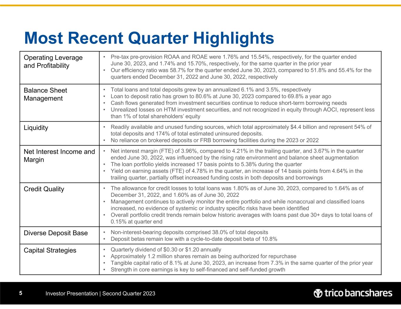 "We were pleased by our ability to grow deposits during the quarter while doing so without the use of brokered funding sources and at rates that were favorable to the Bank. Although nonaccrual and classified loans have increased, they remain below historical averages. Through the Bank's ongoing portfolio review processes and active management, we have not identified any evidence of systemic risk," explained Rick Smith, President and Chief Executive Officer. Peter Wiese, EVP and Chief Financial Officer added, "As deposit balances grew and repayment of principal from the investment security portfolio accelerated, excess proceeds were utilized to reduce the balance and costs associated with short-term borrowing. As we look to the second half of 2023, margin preservation and expense control will be our focused priorities."