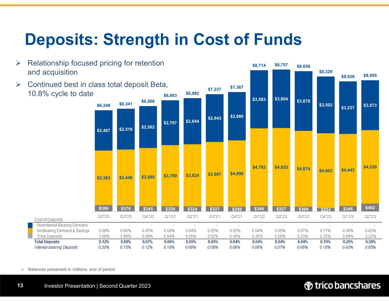 •The average cost of total deposits was 0.58% for the quarter as compared to 0.25% in the trailing quarter and 0.04% in the same quarter of the prior year and, as a result, the Company's total cost of deposits have increased 54 basis points since FOMC rate actions began, which translates to a cycle-to-date deposit beta of 10.8%