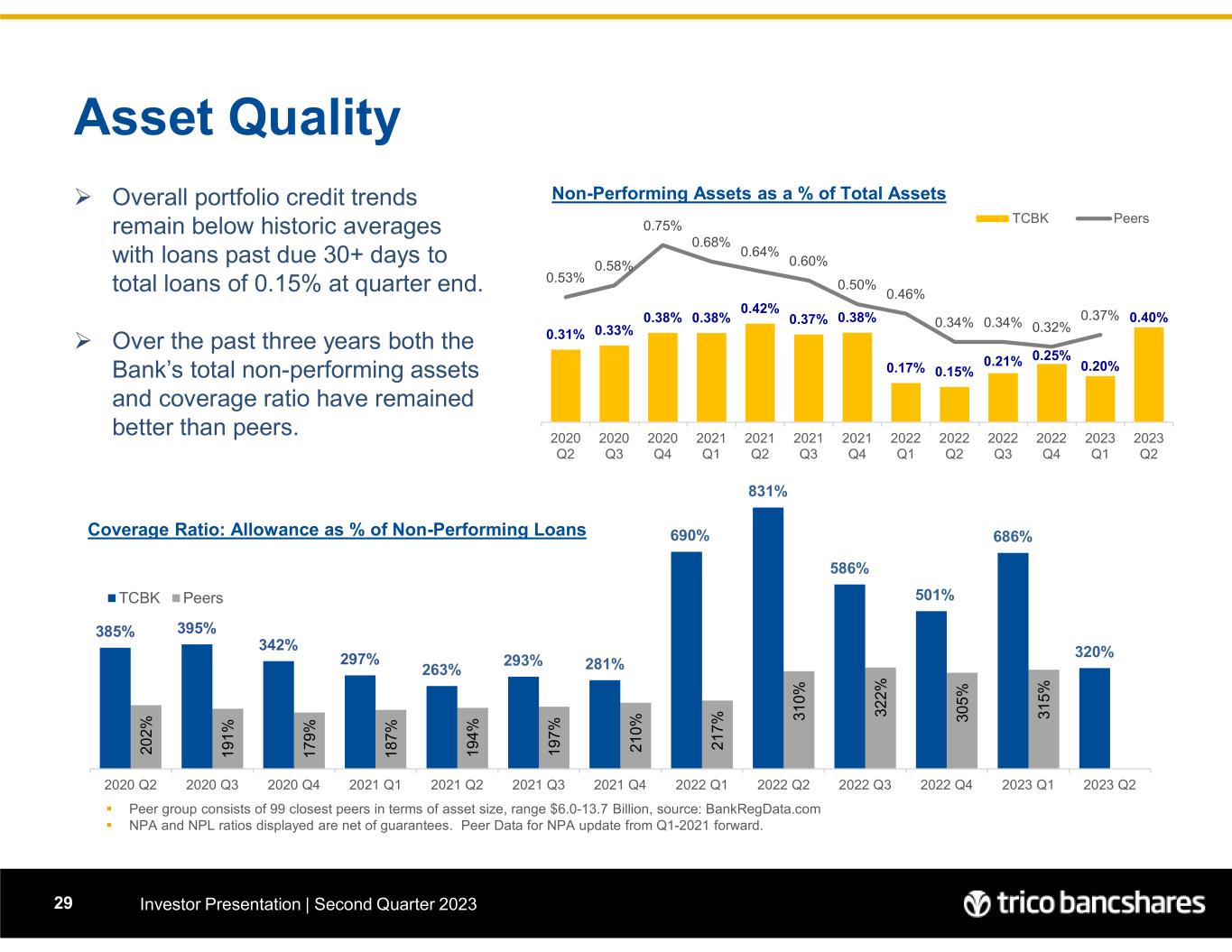 •The allowance for credit losses to total loans was 1.80% as of June 30, 2023, compared to 1.69% as of the trailing quarter end, and 1.60% as of June 30, 2022. Non-performing assets to total assets were 0.41% on June 30, 2023, as compared to 0.20% as of March 31, 2023, and 0.15% at June 30, 2022.