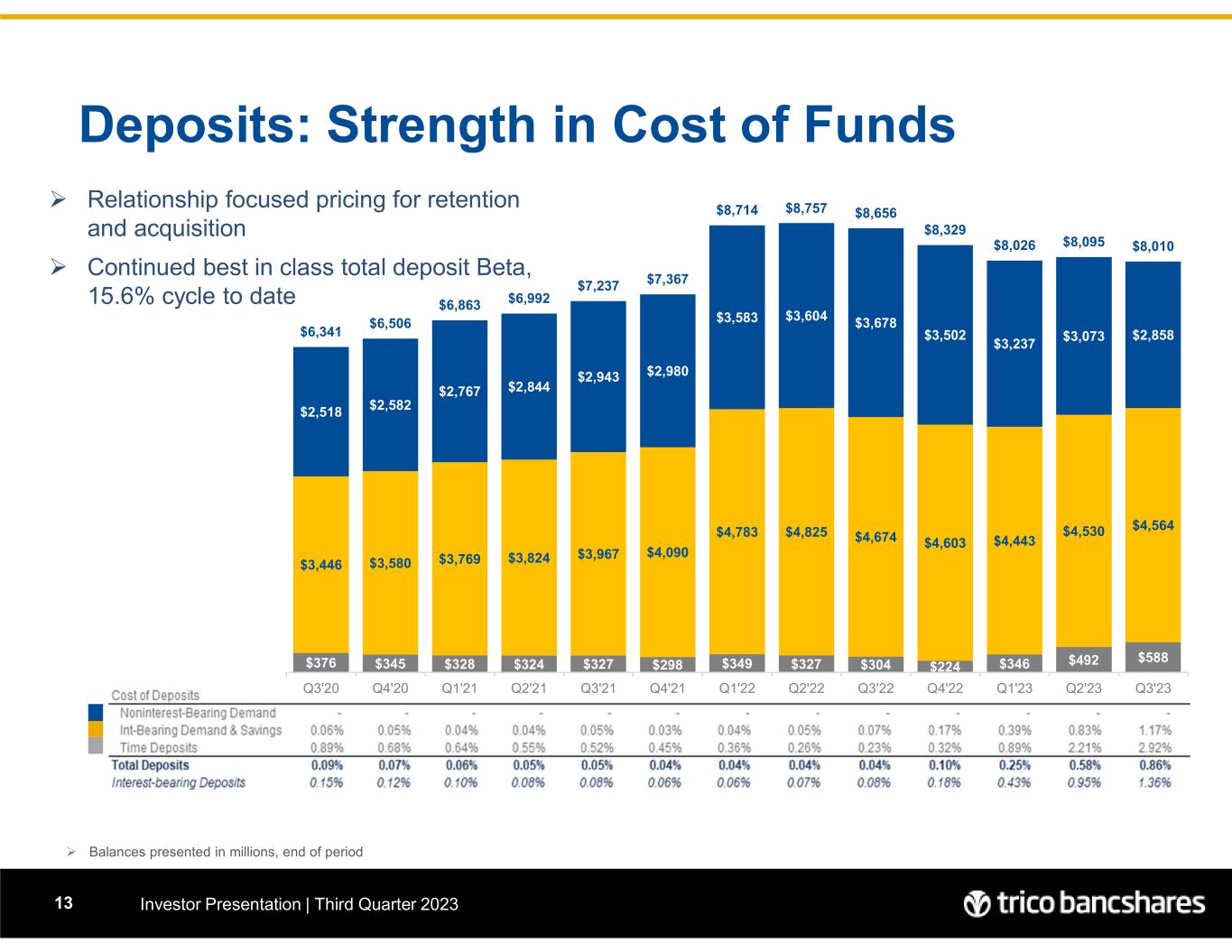 •The average cost of total deposits was 0.86% for the quarter as compared to 0.58% in the trailing quarter and 0.04% in the same quarter of the prior year and, as a result, the Company's total cost of deposits have increased 82 basis points since FOMC rate actions began in March 2022, which translates to a cycle-to-date deposit beta of 15.6%