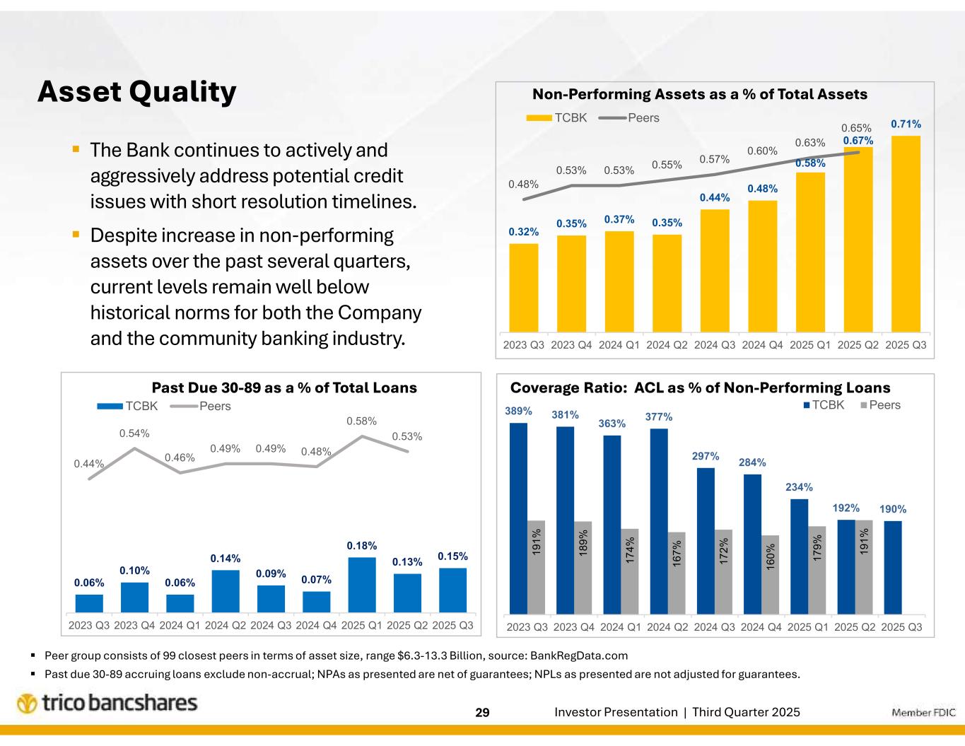 -2025年9月30日現在の貸出金総額に対する貸倒引当金の比率は1.78%であった(直前四半期末は1.79%、2024年9月30日現在 は1.85%)。2025年9月30日現在の不良資産の総資産に対する比率は0.72%であった(2025年6月30日現在0.68%、2024年9月30日現在0.45%)。2025年9月30日現在、ACLは不良債権の190%を占めている。