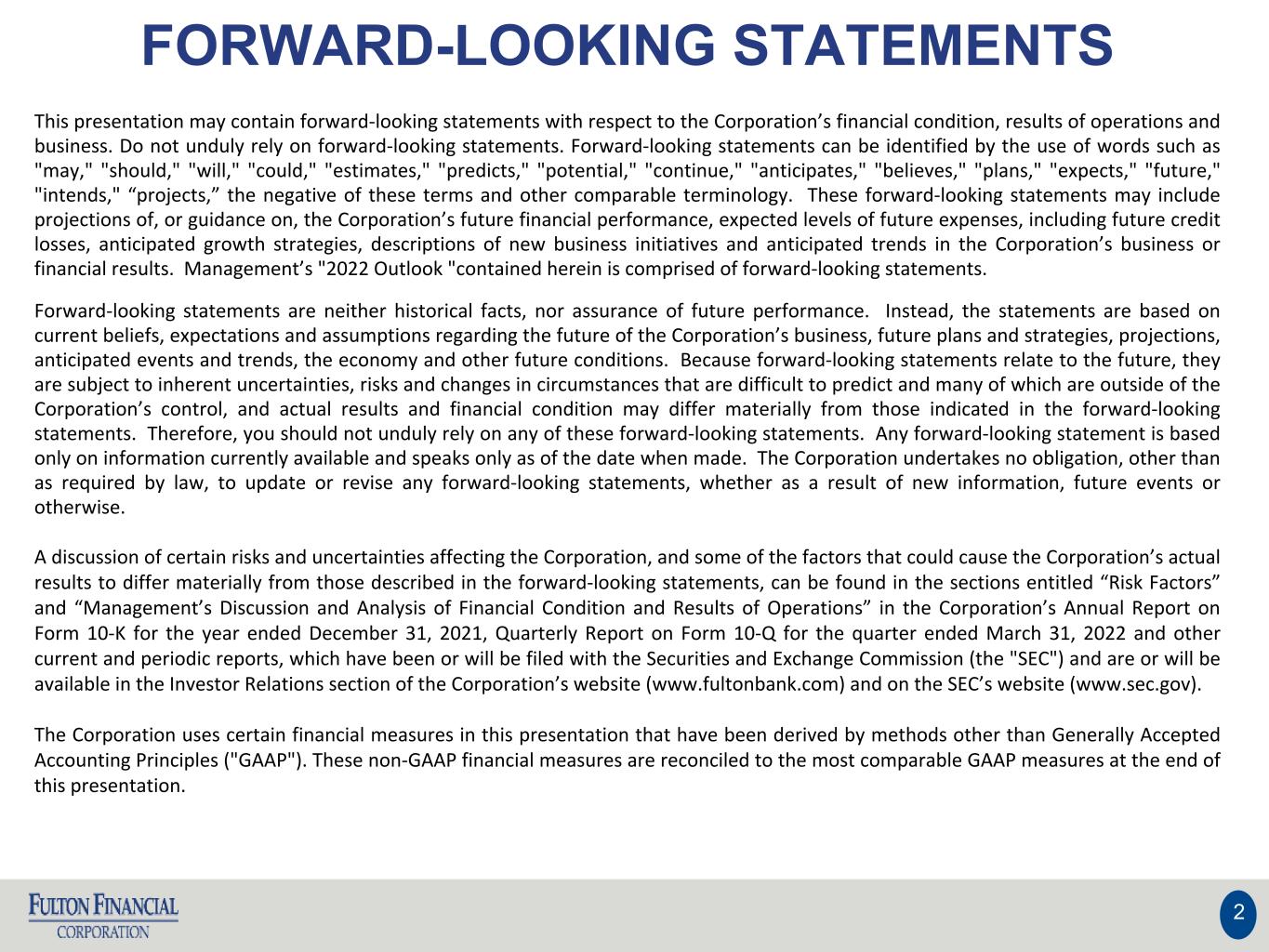 公社に影響を与える特定のリスクと不確実性、および公社の実際の結果が将来予想に関する記述と大きく異なる原因となる要因の一部は、公社の12月31日終了年度のForm 10-Kによる年次報告書の「リスク要因」および「財政状態および経営成績に関する経営者の議論と分析」のセクションに記載されています。これらの報告書は、米国証券取引委員会(SEC)に提出された、または提出される予定であり、当社のウェブサイト(www.fultonbank.com)および SEC のウェブサイト(www.sec.gov)において入手可能です。