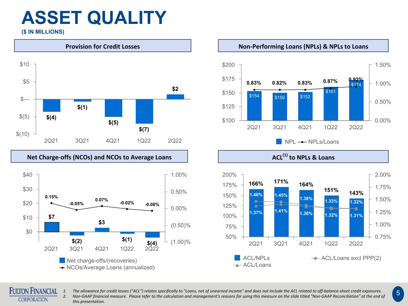 2022 年第 2 四半期は、150 万ドルの貸倒引当金を計上しましたが、2022 年第 1 四半期は 700 万ドルのマイナス、2021 年第 2 四半期は 350 万ドルのマイナスでした。2022 年第 2 四半期の貸倒引当金繰入額は、当四半期中の力強い貸付金の伸びと経済見通しの結果、貸倒引当金を調整するために計上されました。