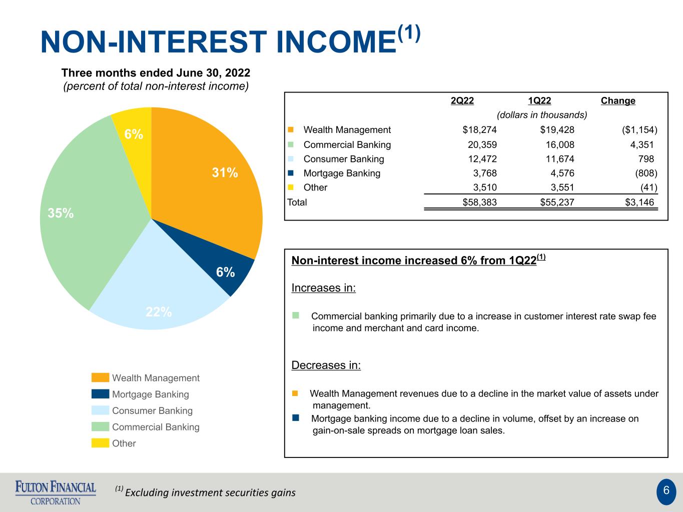 2022 年第 2 四半期の投資有価証券利益前の非金利利益は、前年同期から 310 万ドル(5.7%)増加して 5,840 万ドルでした。非金利収入の増加は、商業顧客向け金利スワップによる手数料収入が 210 万ドル、商業銀行の加盟店及びカード収入が 130 万ドル、消費者金融の手数料が 80 万ドル増加し、ウェルス・マネジメント収入の 120 万ドルの減少が一部相殺されたことによるものです。