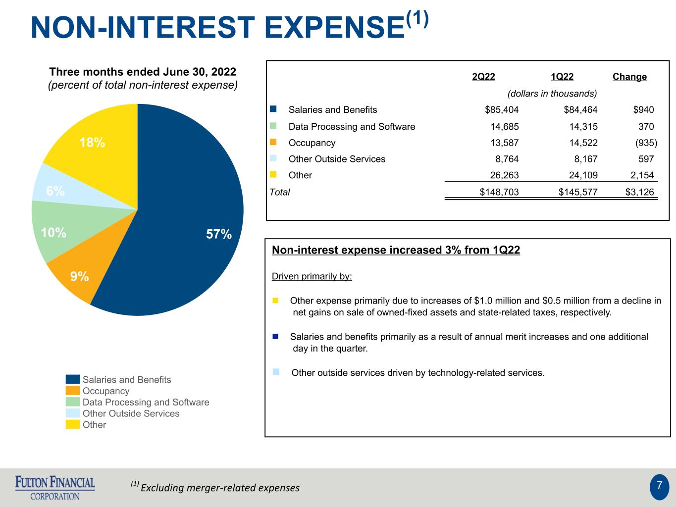 2021 年第 2 四半期と比較して、合併関連費用 100 万ドルを除いた非金利費用は、2022 年第 2 四半期に 790 万ドル(5.6%)増加しましたが、これは主に給与及び従業員給付金が 700 万ドル、純占有費用が 110 万ドル増加したことによるものです。