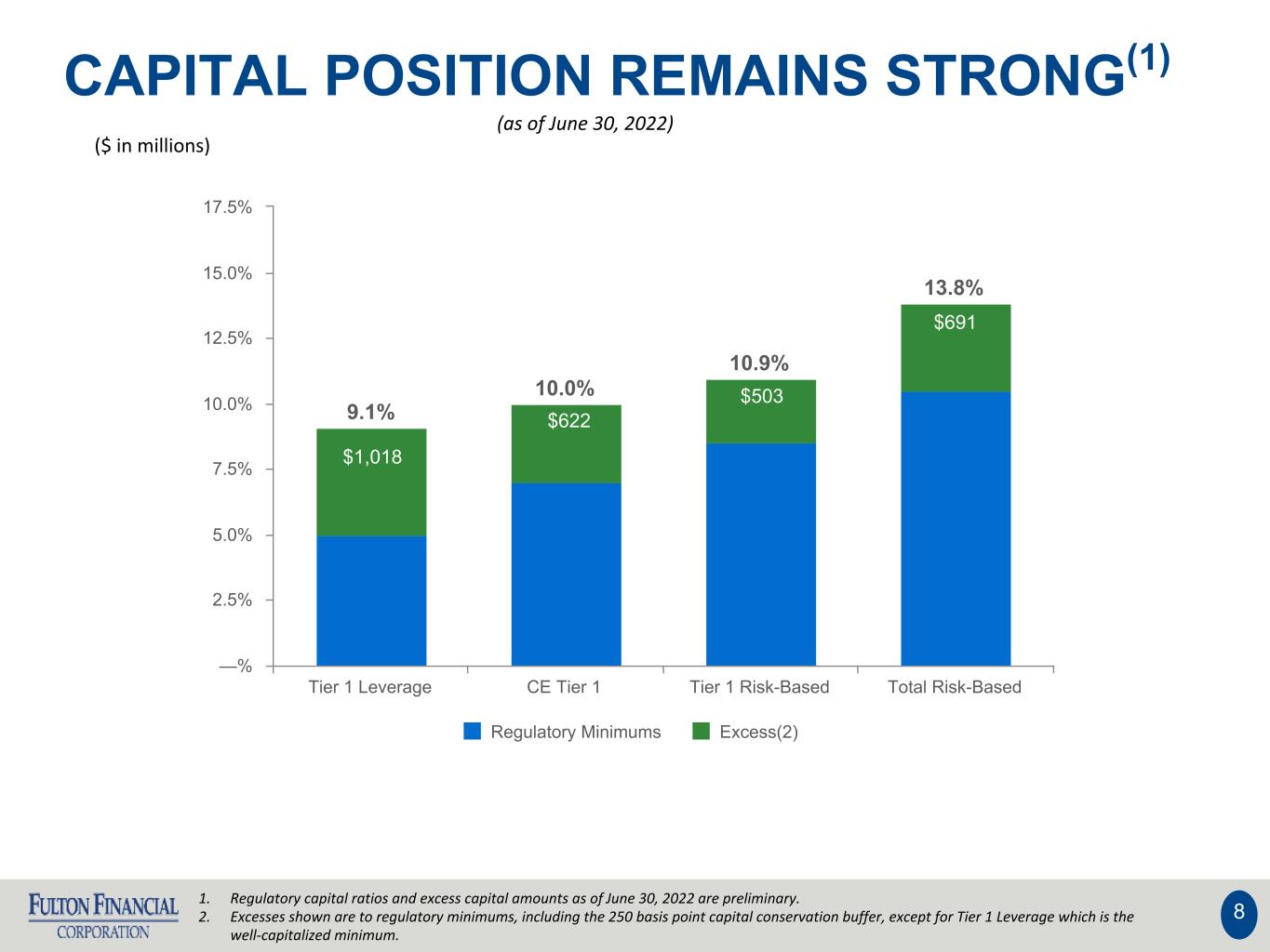 「全体として、フルトンの第 2 四半期の業績と結果には満足しています。ローンの組成は好調で、金利上昇の好影響も見られ始め、手数料収入はモーゲージ・バンキングやウェルス・マネジメント事業における逆風にもかかわらず、堅調でした」と、会長兼CEOのE・フィリップ・ウェンガーは述べました。「また、当社と当社の社員がサービスを提供している地域社会にプラスの影響を与えていることを紹介する、初のCSRレポートを発行しました。