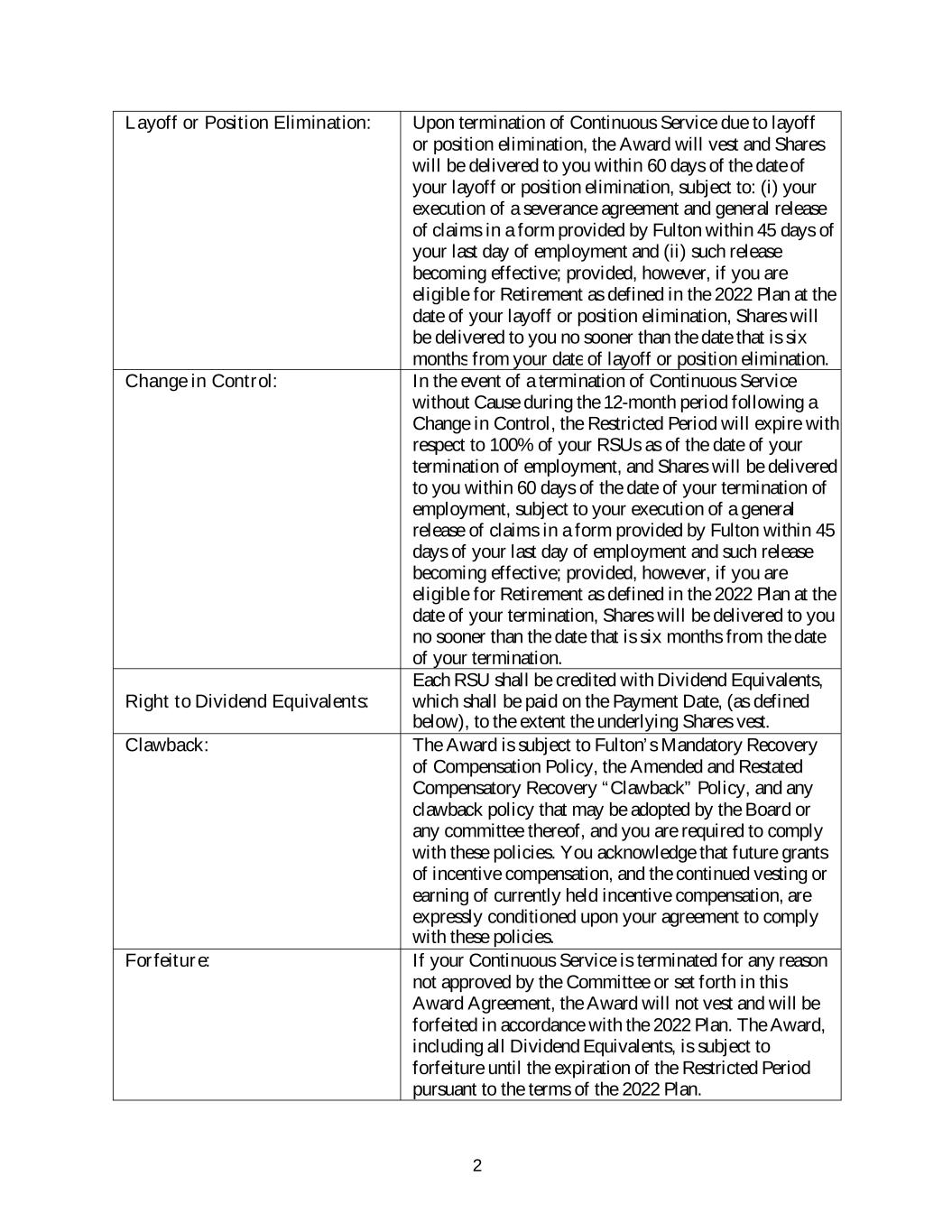 2 Layoff or Position Elimination: Upon termination of Continuous Service due to layoff or position elimination, the Award will vest and Shares will be delivered to you within 60 days of the date of your layoff or position elimination, subject to: (i) your execution of a severance agreement and general release of claims in a form provided by Fulton within 45 days of your last day of employment and (ii) such release becoming effective; provided, however, if you are eligible for Retirement as defined in the 2022 Plan at the date of your layoff or position elimination, Shares will be delivered to you no sooner than the date that is six months from your date of layoff or position elimination. Change in Control: In the event of a termination of Continuous Service without Cause during the 12-month period following a Change in Control, the Restricted Period will expire with respect to 100% of your RSUs as of the date of your termination of employment, and Shares will be delivered to you within 60 days of the date of your termination of employment, subject to your execution of a general release of claims in a form provided by Fulton within 45 days of your last day of employment and such release becoming effective; provided, however, if you are eligible for Retirement as defined in the 2022 Plan at the date of your termination, Shares will be delivered to you no sooner than the date that is six months from the date of your termination. Right to Dividend Equivalents: Each RSU shall be credited with Dividend Equivalents, which shall be paid on the Payment Date, (as defined below), to the extent the underlying Shares vest. Clawback: The Award is subject to Fulton’s Mandatory Recovery of Compensation Policy, the Amended and Restated Compensatory Recovery “Clawback” Policy, and any clawback policy that may be adopted by the Board or any committee thereof, and you are required to comply with these policies. You acknowledge that future grants of incentive compensation, and the continued vesting or earning of currently held incentive compensation, are expressly conditioned upon your agreement to comply with these policies. Forfeiture: If your Continuous Service is terminated for any reason not approved by the Committee or set forth in this Award Agreement, the Award will not vest and will be forfeited in accordance with the 2022 Plan. The Award, including all Dividend Equivalents, is subject to forfeiture until the expiration of the Restricted Period pursuant to the terms of the 2022 Plan.