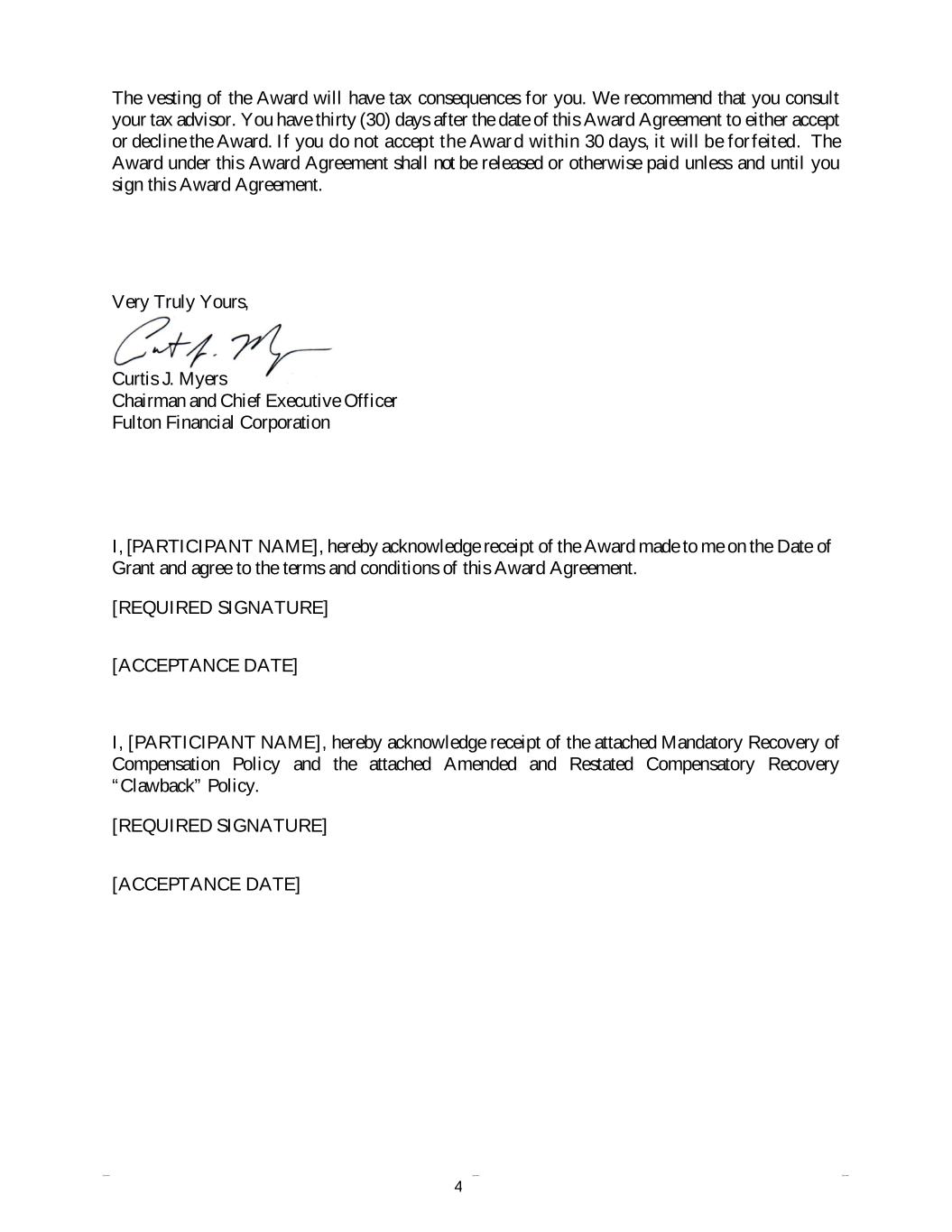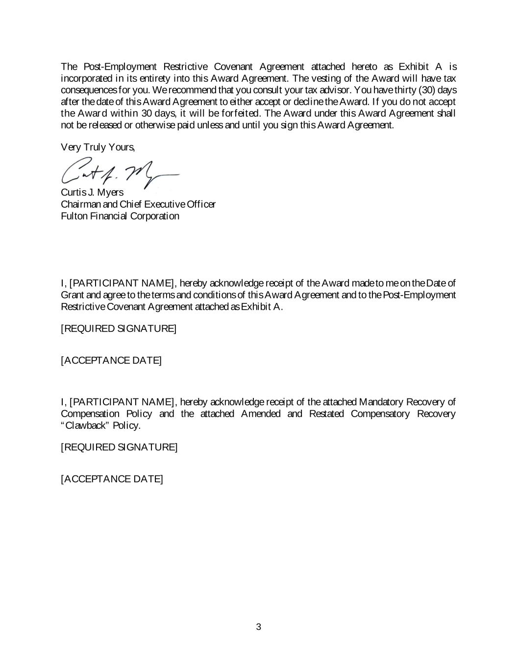 3 The Post-Employment Restrictive Covenant Agreement attached hereto as Exhibit A is incorporated in its entirety into this Award Agreement. The vesting of the Award will have tax consequences for you. We recommend that you consult your tax advisor. You have thirty (30) days after the date of this Award Agreement to either accept or decline the Award. If you do not accept the Award within 30 days, it will be forfeited. The Award under this Award Agreement shall not be released or otherwise paid unless and until you sign this Award Agreement. Very Truly Yours, Curtis J. Myers Chairman and Chief Executive Officer Fulton Financial Corporation I, [PARTICIPANT NAME], hereby acknowledge receipt of the Award made to me on the Date of Grant and agree to the terms and conditions of this Award Agreement and to the Post-Employment Restrictive Covenant Agreement attached as Exhibit A. [REQUIRED SIGNATURE] [ACCEPTANCE DATE] I, [PARTICIPANT NAME], hereby acknowledge receipt of the attached Mandatory Recovery of Compensation Policy and the attached Amended and Restated Compensatory Recovery “Clawback” Policy. [REQUIRED SIGNATURE] [ACCEPTANCE DATE]