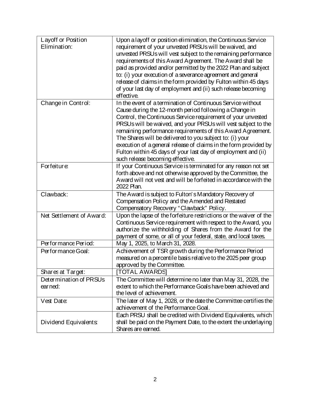 2 Layoff or Position Elimination: Upon a layoff or position elimination, the Continuous Service requirement of your unvested PRSUs will be waived, and unvested PRSUs will vest subject to the remaining performance requirements of this Award Agreement. The Award shall be paid as provided and/or permitted by the 2022 Plan and subject to: (i) your execution of a severance agreement and general release of claims in the form provided by Fulton within 45 days of your last day of employment and (ii) such release becoming effective. Change in Control: In the event of a termination of Continuous Service without Cause during the 12-month period following a Change in Control, the Continuous Service requirement of your unvested PRSUs will be waived, and your PRSUs will vest subject to the remaining performance requirements of this Award Agreement. The Shares will be delivered to you subject to: (i) your execution of a general release of claims in the form provided by Fulton within 45 days of your last day of employment and (ii) such release becoming effective. Forfeiture: If your Continuous Service is terminated for any reason not set forth above and not otherwise approved by the Committee, the Award will not vest and will be forfeited in accordance with the 2022 Plan. Clawback: The Award is subject to Fulton’s Mandatory Recovery of Compensation Policy and the Amended and Restated Compensatory Recovery “Clawback” Policy. Net Settlement of Award: Upon the lapse of the forfeiture restrictions or the waiver of the Continuous Service requirement with respect to the Award, you authorize the withholding of Shares from the Award for the payment of some, or all of your federal, state, and local taxes. Performance Period: May 1, 2025, to March 31, 2028. Performance Goal: Achievement of TSR growth during the Performance Period measured on a percentile basis relative to the 2025 peer group approved by the Committee. Shares at Target: [TOTAL AWARDS] Determination of PRSUs earned: The Committee will determine no later than May 31, 2028, the extent to which the Performance Goals have been achieved and the level of achievement. Vest Date: The later of May 1, 2028, or the date the Committee certifies the achievement of the Performance Goal. Dividend Equivalents: Each PRSU shall be credited with Dividend Equivalents, which shall be paid on the Payment Date, to the extent the underlaying Shares are earned.