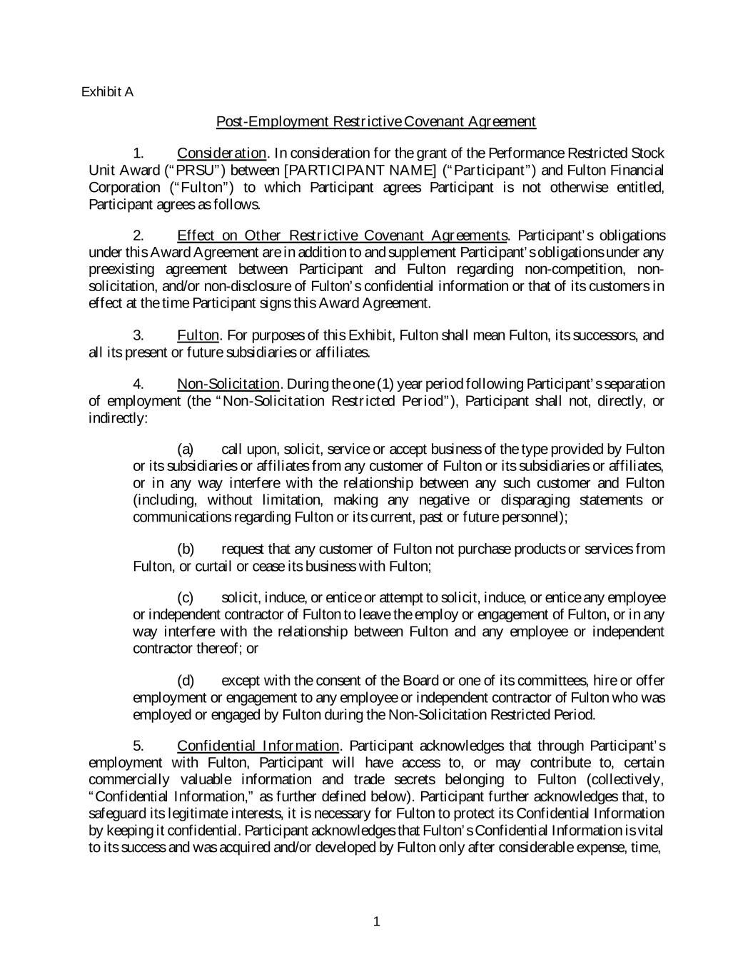 1 Exhibit A Post-Employment Restrictive Covenant Agreement 1. Consideration. In consideration for the grant of the Performance Restricted Stock Unit Award (“PRSU”) between [PARTICIPANT NAME] (“Participant”) and Fulton Financial Corporation (“Fulton”) to which Participant agrees Participant is not otherwise entitled, Participant agrees as follows. 2. Effect on Other Restrictive Covenant Agreements. Participant’s obligations under this Award Agreement are in addition to and supplement Participant’s obligations under any preexisting agreement between Participant and Fulton regarding non-competition, non- solicitation, and/or non-disclosure of Fulton’s confidential information or that of its customers in effect at the time Participant signs this Award Agreement. 3. Fulton. For purposes of this Exhibit, Fulton shall mean Fulton, its successors, and all its present or future subsidiaries or affiliates. 4. Non-Solicitation. During the one (1) year period following Participant’s separation of employment (the “Non-Solicitation Restricted Period”), Participant shall not, directly, or indirectly: (a) call upon, solicit, service or accept business of the type provided by Fulton or its subsidiaries or affiliates from any customer of Fulton or its subsidiaries or affiliates, or in any way interfere with the relationship between any such customer and Fulton (including, without limitation, making any negative or disparaging statements or communications regarding Fulton or its current, past or future personnel); (b) request that any customer of Fulton not purchase products or services from Fulton, or curtail or cease its business with Fulton; (c) solicit, induce, or entice or attempt to solicit, induce, or entice any employee or independent contractor of Fulton to leave the employ or engagement of Fulton, or in any way interfere with the relationship between Fulton and any employee or independent contractor thereof; or (d) except with the consent of the Board or one of its committees, hire or offer employment or engagement to any employee or independent contractor of Fulton who was employed or engaged by Fulton during the Non-Solicitation Restricted Period. 5. Confidential Information. Participant acknowledges that through Participant’s employment with Fulton, Participant will have access to, or may contribute to, certain commercially valuable information and trade secrets belonging to Fulton (collectively, “Confidential Information,” as further defined below). Participant further acknowledges that, to safeguard its legitimate interests, it is necessary for Fulton to protect its Confidential Information by keeping it confidential. Participant acknowledges that Fulton’s Confidential Information is vital to its success and was acquired and/or developed by Fulton only after considerable expense, time,