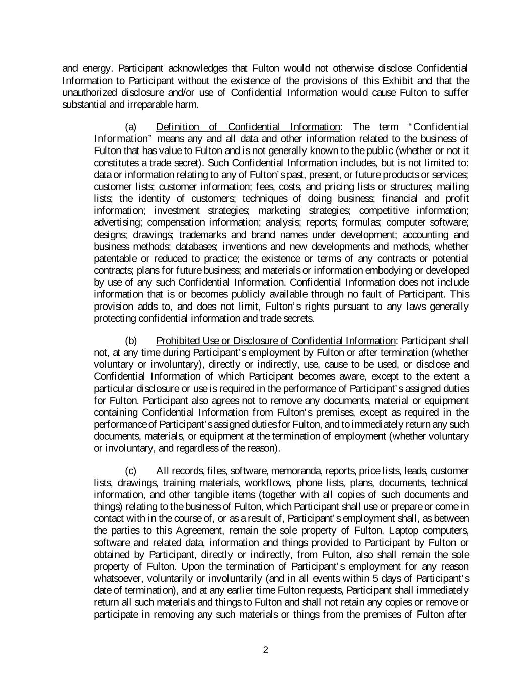2 and energy. Participant acknowledges that Fulton would not otherwise disclose Confidential Information to Participant without the existence of the provisions of this Exhibit and that the unauthorized disclosure and/or use of Confidential Information would cause Fulton to suffer substantial and irreparable harm. (a) Definition of Confidential Information: The term “Confidential Information” means any and all data and other information related to the business of Fulton that has value to Fulton and is not generally known to the public (whether or not it constitutes a trade secret). Such Confidential Information includes, but is not limited to: data or information relating to any of Fulton’s past, present, or future products or services; customer lists; customer information; fees, costs, and pricing lists or structures; mailing lists; the identity of customers; techniques of doing business; financial and profit information; investment strategies; marketing strategies; competitive information; advertising; compensation information; analysis; reports; formulas; computer software; designs; drawings; trademarks and brand names under development; accounting and business methods; databases; inventions and new developments and methods, whether patentable or reduced to practice; the existence or terms of any contracts or potential contracts; plans for future business; and materials or information embodying or developed by use of any such Confidential Information. Confidential Information does not include information that is or becomes publicly available through no fault of Participant. This provision adds to, and does not limit, Fulton’s rights pursuant to any laws generally protecting confidential information and trade secrets. (b) Prohibited Use or Disclosure of Confidential Information: Participant shall not, at any time during Participant’s employment by Fulton or after termination (whether voluntary or involuntary), directly or indirectly, use, cause to be used, or disclose and Confidential Information of which Participant becomes aware, except to the extent a particular disclosure or use is required in the performance of Participant’s assigned duties for Fulton. Participant also agrees not to remove any documents, material or equipment containing Confidential Information from Fulton’s premises, except as required in the performance of Participant’s assigned duties for Fulton, and to immediately return any such documents, materials, or equipment at the termination of employment (whether voluntary or involuntary, and regardless of the reason). (c) All records, files, software, memoranda, reports, price lists, leads, customer lists, drawings, training materials, workflows, phone lists, plans, documents, technical information, and other tangible items (together with all copies of such documents and things) relating to the business of Fulton, which Participant shall use or prepare or come in contact with in the course of, or as a result of, Participant’s employment shall, as between the parties to this Agreement, remain the sole property of Fulton. Laptop computers, software and related data, information and things provided to Participant by Fulton or obtained by Participant, directly or indirectly, from Fulton, also shall remain the sole property of Fulton. Upon the termination of Participant’s employment for any reason whatsoever, voluntarily or involuntarily (and in all events within 5 days of Participant’s date of termination), and at any earlier time Fulton requests, Participant shall immediately return all such materials and things to Fulton and shall not retain any copies or remove or participate in removing any such materials or things from the premises of Fulton after