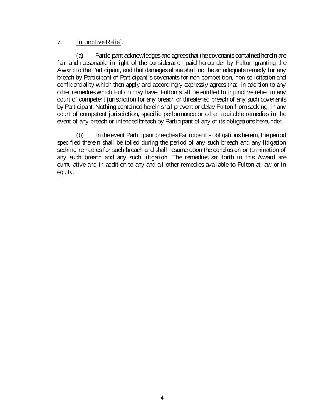 4 7. Injunctive Relief. (a) Participant acknowledges and agrees that the covenants contained herein are fair and reasonable in light of the consideration paid hereunder by Fulton granting the Award to the Participant, and that damages alone shall not be an adequate remedy for any breach by Participant of Participant’s covenants for non-competition, non-solicitation and confidentiality which then apply and accordingly expressly agrees that, in addition to any other remedies which Fulton may have, Fulton shall be entitled to injunctive relief in any court of competent jurisdiction for any breach or threatened breach of any such covenants by Participant. Nothing contained herein shall prevent or delay Fulton from seeking, in any court of competent jurisdiction, specific performance or other equitable remedies in the event of any breach or intended breach by Participant of any of its obligations hereunder. (b) In the event Participant breaches Participant’s obligations herein, the period specified therein shall be tolled during the period of any such breach and any litigation seeking remedies for such breach and shall resume upon the conclusion or termination of any such breach and any such litigation. The remedies set forth in this Award are cumulative and in addition to any and all other remedies available to Fulton at law or in equity.