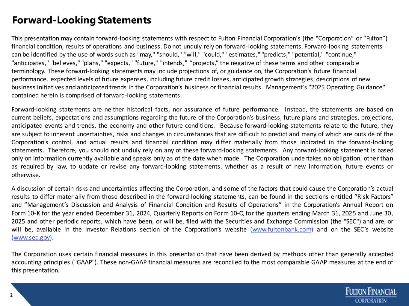 公社に影響を及ぼす特定のリスクと不確実性、および公社の実際の業績が将来の見通しに関する記述と大きく異なる可能性のある要因については、公社の 12 月 31 日を末日とする年度の年次報告書(Form 10-K)の「リスク要因」および「経営陣による財政状態および経営成績の検討および分析」の項に記載されています、これらは米国証券取引委員会(以下「SEC」)に提出済みまたは提出予定で、当行のウェブサイト(www.fultonbank.com) および SEC のウェブサイト(www.sec.gov)の投資家向け情報セクションで入手可能です。