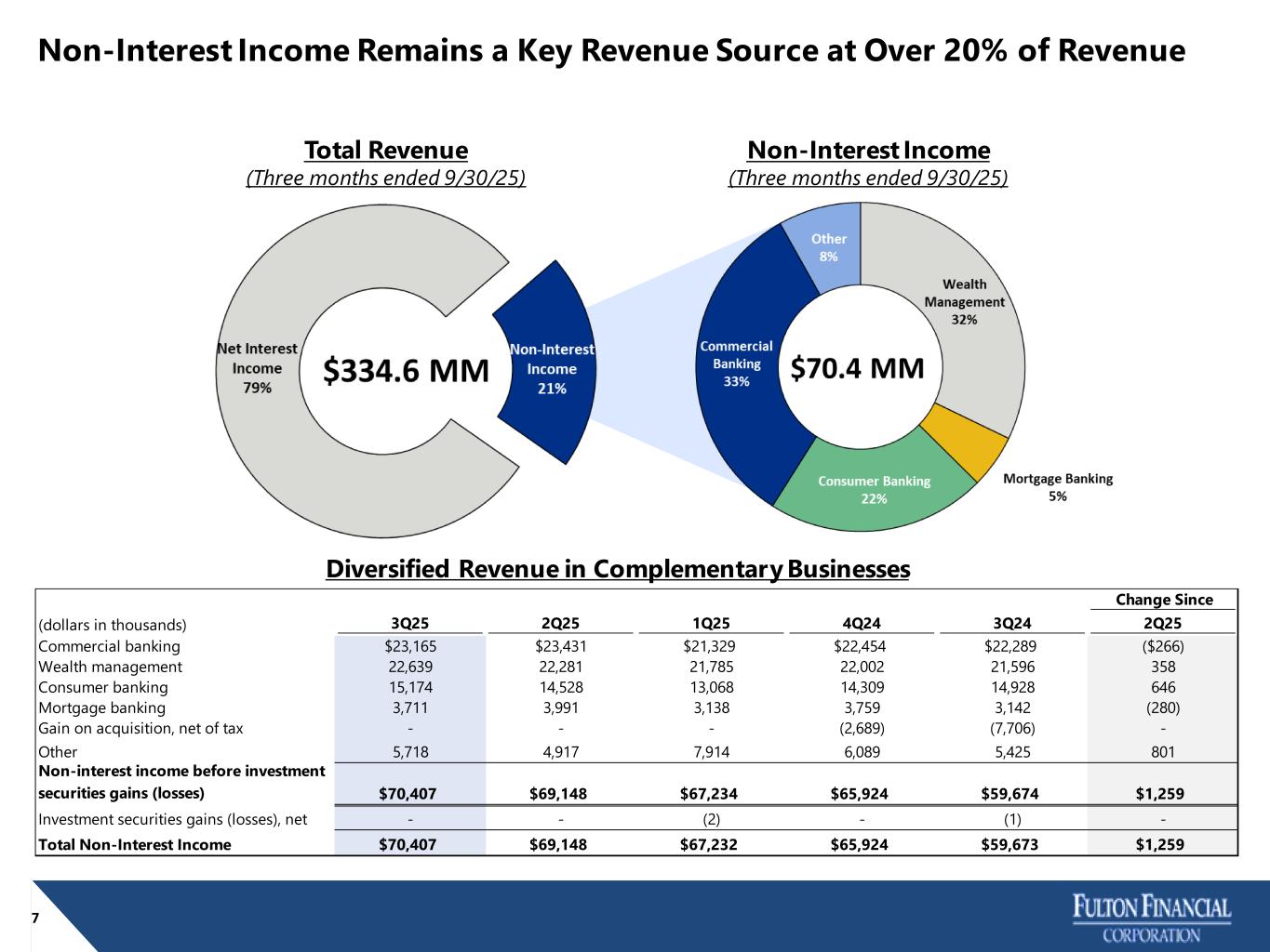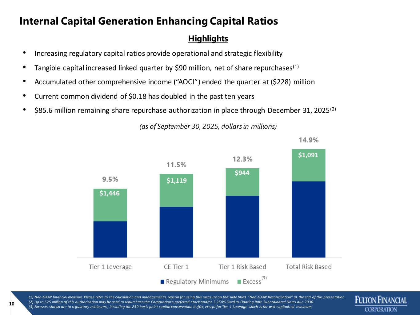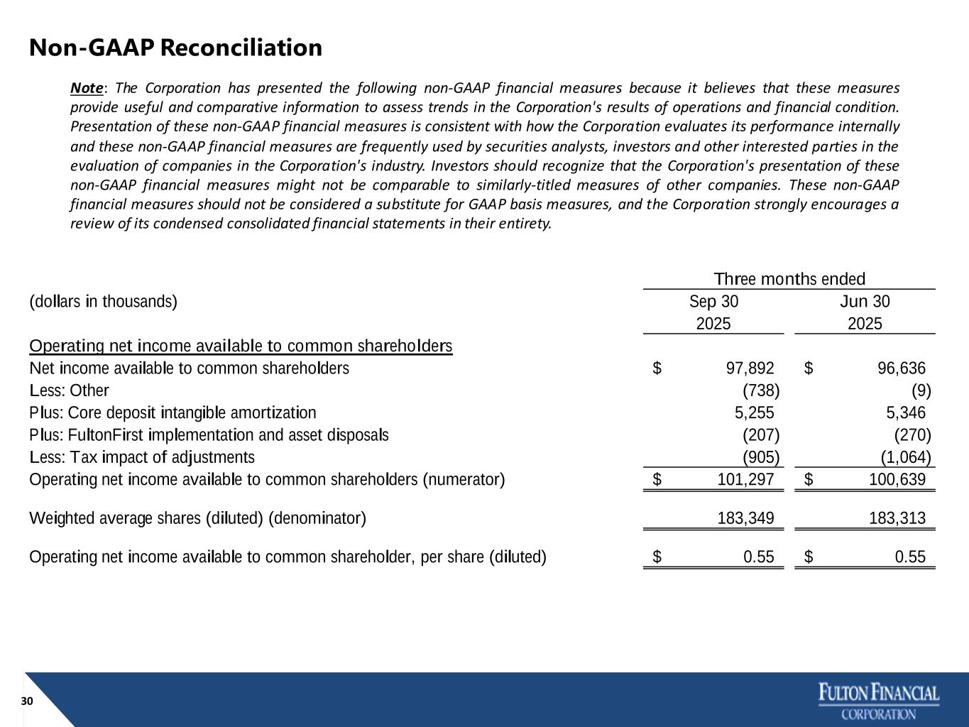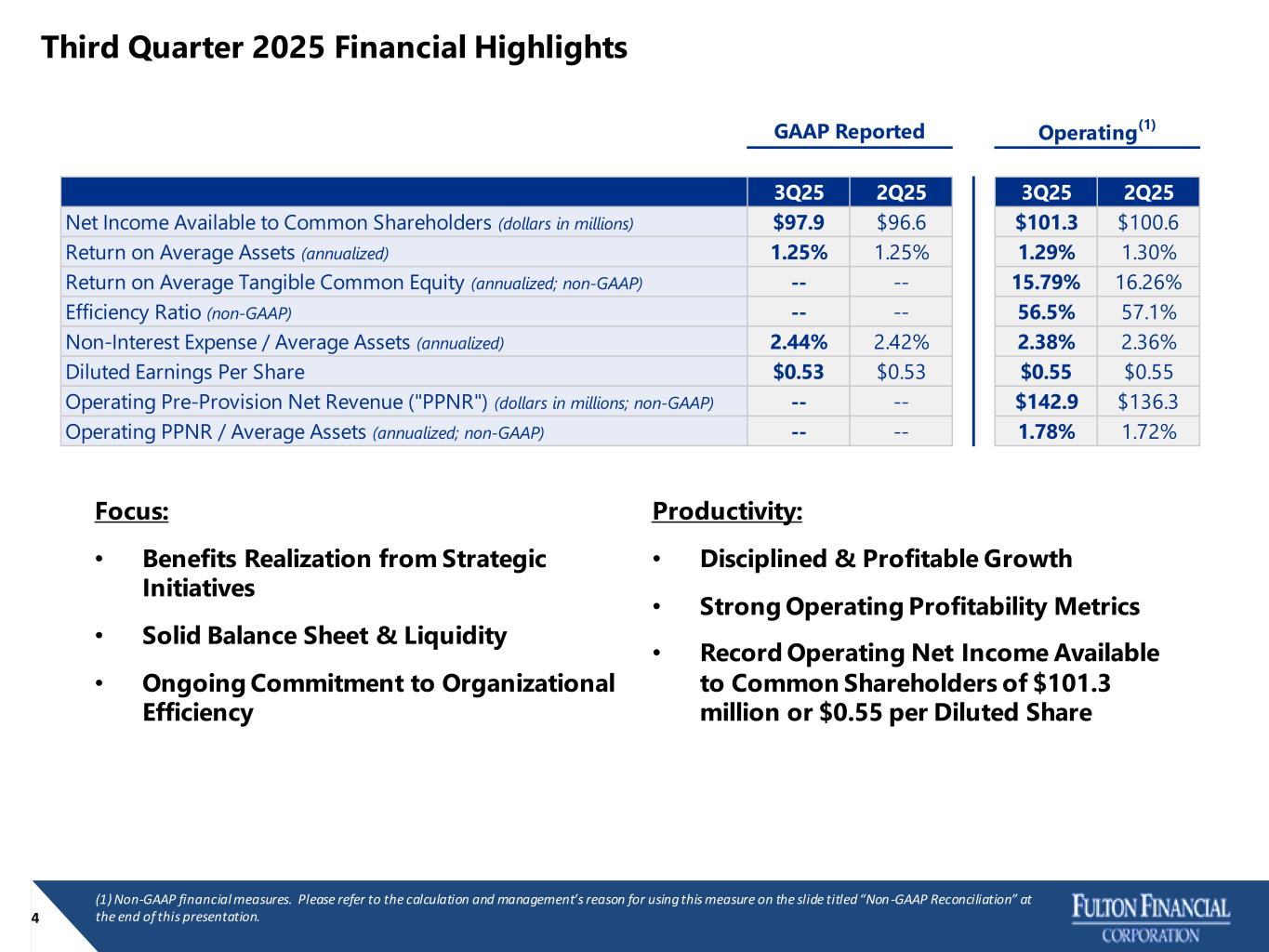 (2025年10月21日)-ペンシルベニア州ランカスター-フルトン・ファイナンシャル・コーポレーション(NASDAQ: FULT)(以下「フルトン」または「コーポレーション」)は、2025年第3四半期の普通株主に帰属する当期純利益を9,790万ドル(希薄化後1株当たり0.53ドル)と報告し、2025年第2四半期と比較して130万ドル増加した。2025年9月30日に終了した3ヵ月間の普通株主に帰属する営業純利益は1億130万ドル(1)、希薄化後1株当たり0.55ドル(1)で、2025年第2四半期と比較して0.7百万ドル増加した。