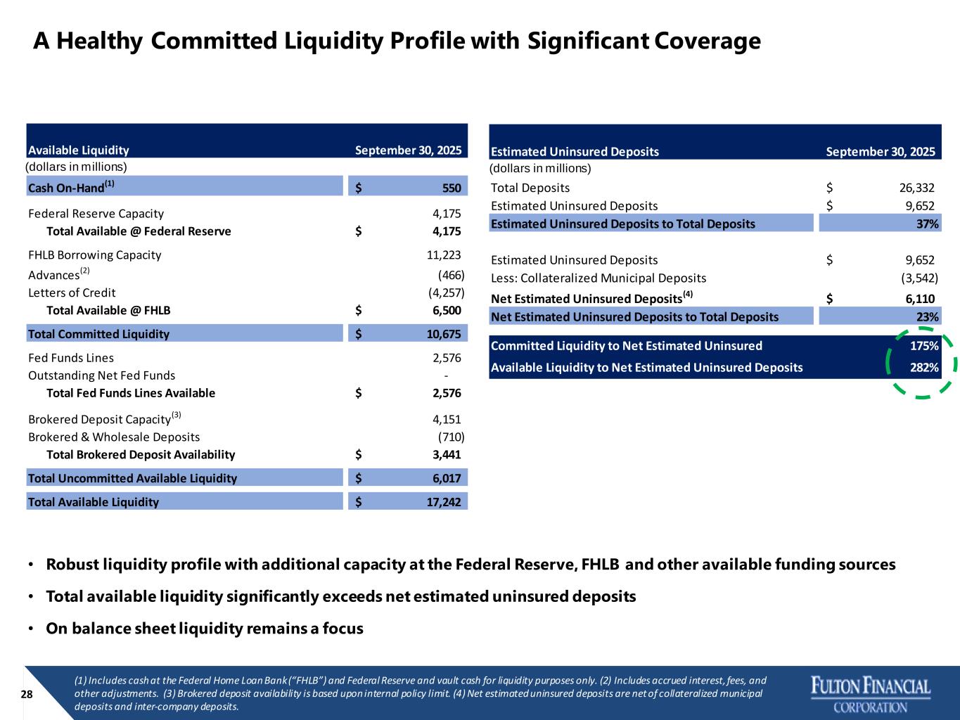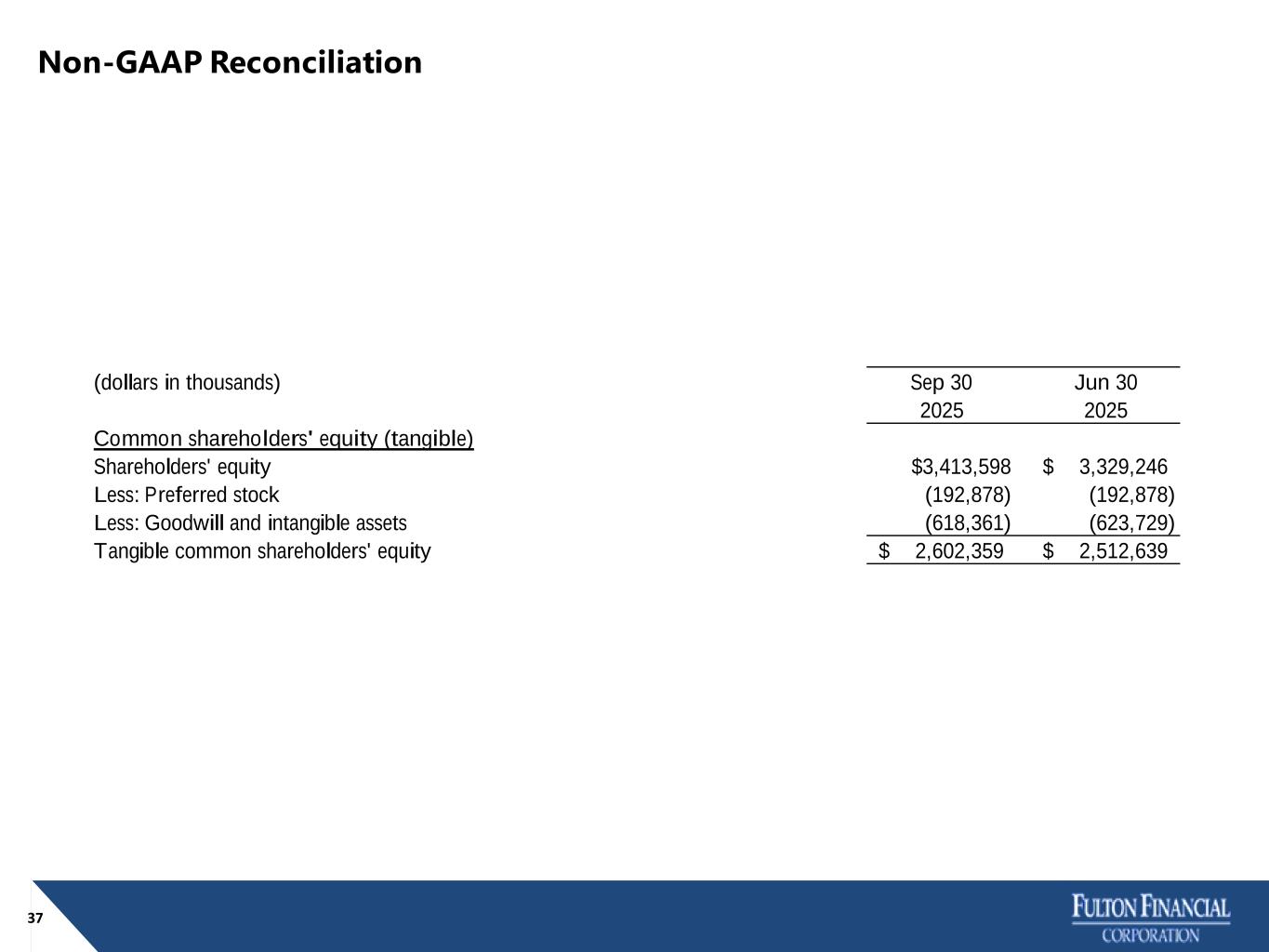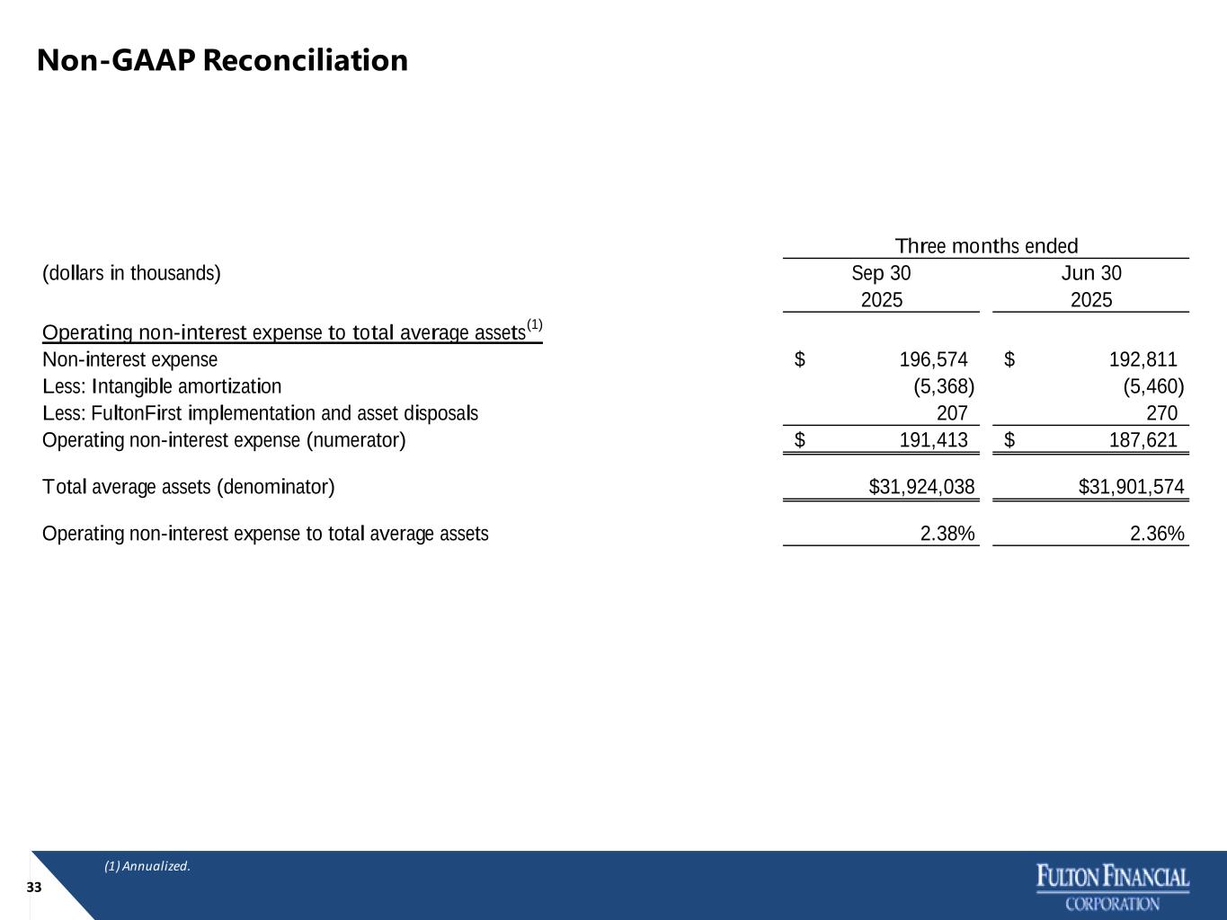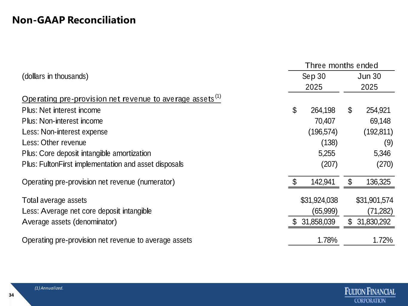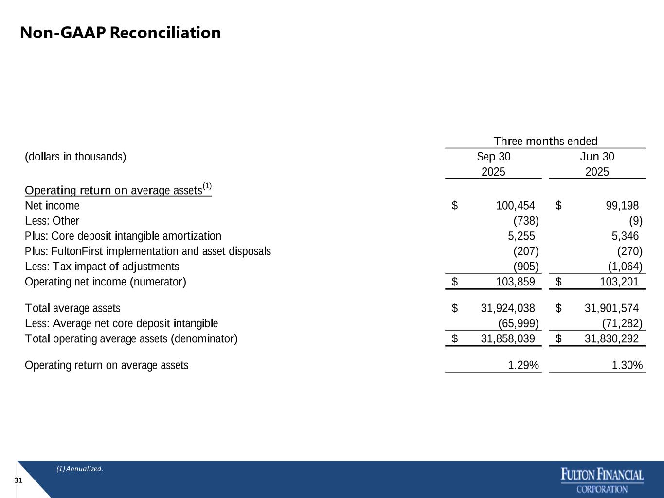(2025年10月21日)-ペンシルベニア州ランカスター-フルトン・ファイナンシャル・コーポレーション(NASDAQ: FULT)(以下「フルトン」または「コーポレーション」)は、2025年第3四半期の普通株主に帰属する当期純利益を9,790万ドル(希薄化後1株当たり0.53ドル)と報告し、2025年第2四半期と比較して130万ドル増加した。2025年9月30日に終了した3ヵ月間の普通株主に帰属する営業純利益は1億130万ドル(1)、希薄化後1株当たり0.55ドル(1)で、2025年第2四半期と比較して0.7百万ドル増加した。