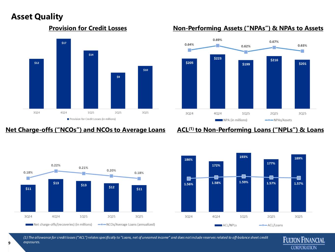 -2025年第3四半期の貸倒引当金繰入額は1,020万ドルとなり、その結果、2025年9月30日現在の純貸付金に帰属する貸倒引当金は3億7,630万ドル(純貸付金合計の1.57%)となった。