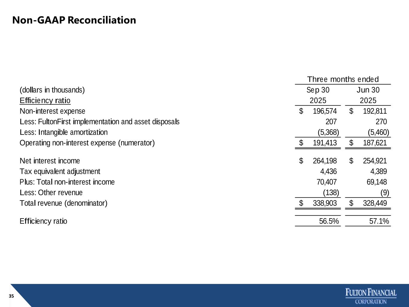 -非金利費用は、前年同期の1億9,280万ドルに対し、1億9,660万ドルとなりました。非金利費用が380万ドル増加した主な要因は、給与および従業員給付費用が410万ドル増加したことで す。これは主に、インセンティブ報酬費用の増加、および2025年第3四半期に1暦日追加されたことによる ものです。給与および従業員給付費用には、従業員の退職金費用0.5百万ドルが含まれています。