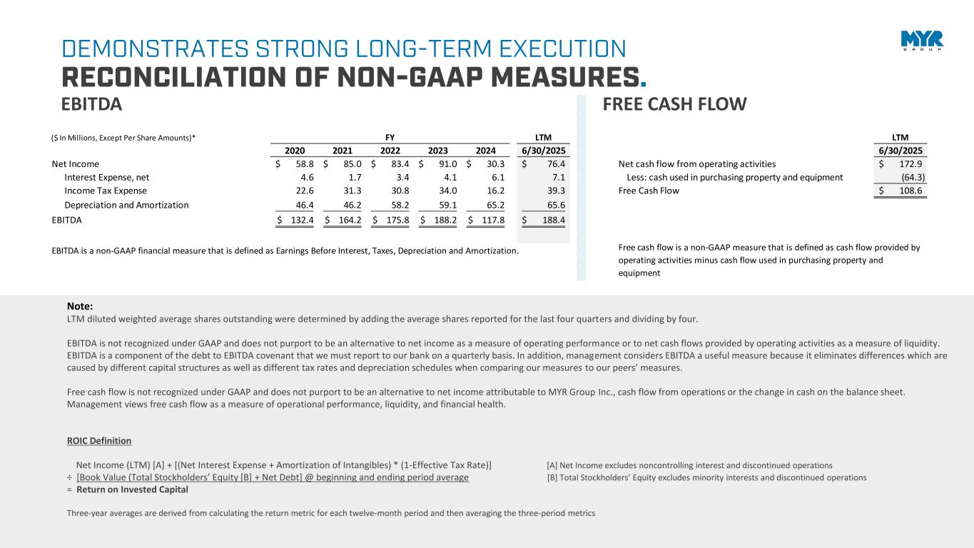 21 Note: LTM diluted weighted average shares outstanding were determined by adding the average shares reported for the last four quarters and dividing by four. EBITDA is not recognized under GAAP and does not purport to be an alternative to net income as a measure of operating performance or to net cash flows provided by operating activities as a measure of liquidity. EBITDA is a component of the debt to EBITDA covenant that we must report to our bank on a quarterly basis. In addition, management considers EBITDA a useful measure because it eliminates differences which are caused by different capital structures as well as different tax rates and depreciation schedules when comparing our measures to our peers’ measures. Free cash flow is not recognized under GAAP and does not purport to be an alternative to net income attributable to MYR Group Inc., cash flow from operations or the change in cash on the balance sheet. Management views free cash flow as a measure of operational performance, liquidity, and financial health. ROIC Definition Net Income (LTM) [A] + [(Net Interest Expense + Amortization of Intangibles) * (1-Effective Tax Rate)] [A] Net Income excludes noncontrolling interest and discontinued operations ÷ [Book Value (Total Stockholders’ Equity [B] + Net Debt] @ beginning and ending period average [B] Total Stockholders’ Equity excludes minority interests and discontinued operations = Return on Invested Capital Three-year averages are derived from calculating the return metric for each twelve-month period and then averaging the three-period metrics EBITDA FREE CASH FLOW DEMONSTRATES STRONG LONG-TERM EXECUTION RECONCILIATION OF NON-GAAP MEASURES. ($ In Millions, Except Per Share Amounts)* FY LTM LTM 2020 2021 2022 2023 2024 6/30/2025 6/30/2025 Net Income 58.8$ 85.0$ 83.4$ 91.0$ 30.3$ 76.4$ Net cash flow from operating activities 172.9$ Interest Expense, net 4.6 1.7 3.4 4.1 6.1 7.1 Less: cash used in purchasing property and equipment (64.3) Income Tax Expense 22.6 31.3 30.8 34.0 16.2 39.3 Free Cash Flow 108.6$ Depreciation and Amortization 46.4 46.2 58.2 59.1 65.2 65.6 EBITDA 132.4$ 164.2$ 175.8$ 188.2$ 117.8$ 188.4$ EBITDA is a non-GAAP financial measure that is defined as Earnings Before Interest, Taxes, Depreciation and Amortization. Free cash flow is a non-GAAP measure that is defined as cash flow provided by operating activities minus cash flow used in purchasing property and equipment