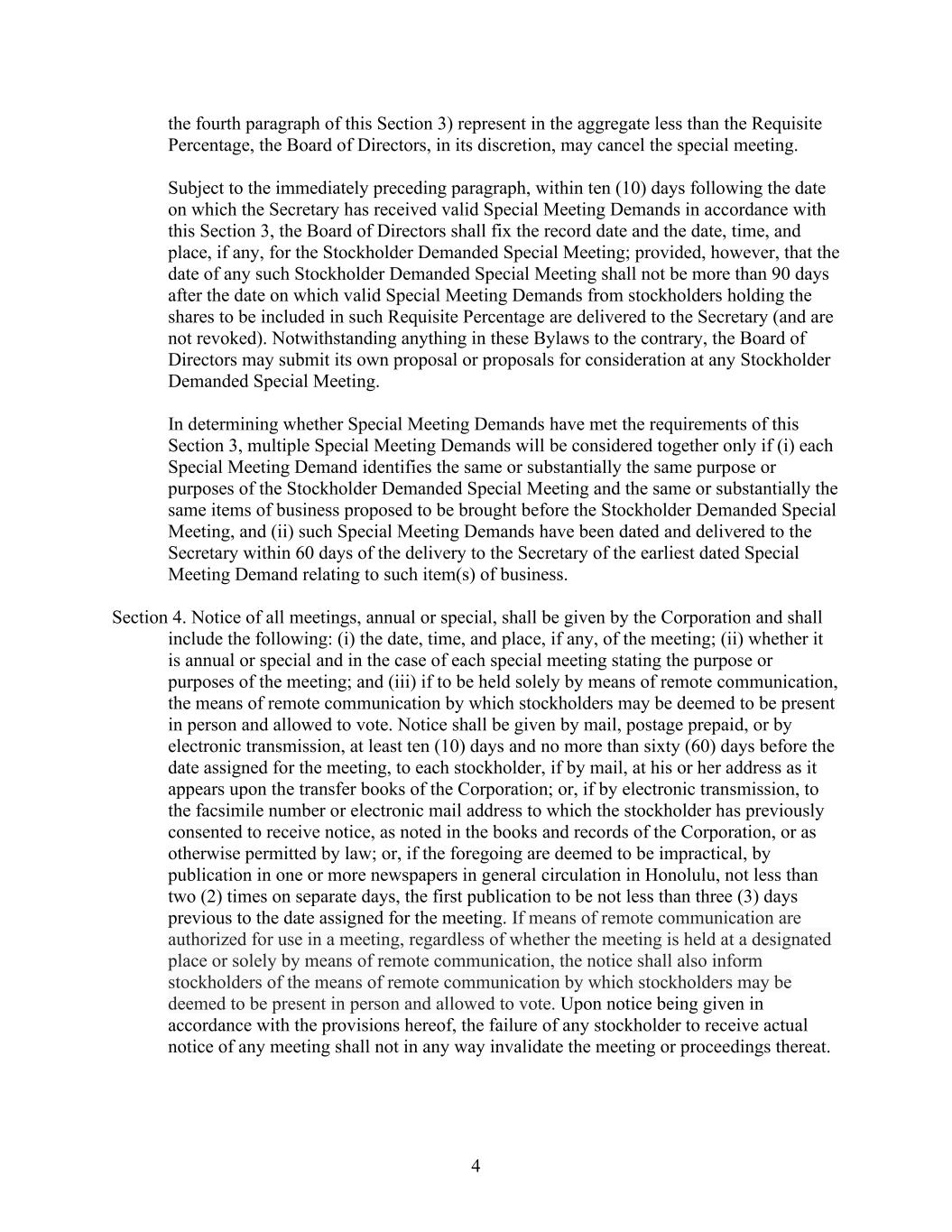 4 the fourth paragraph of this Section 3) represent in the aggregate less than the Requisite Percentage, the Board of Directors, in its discretion, may cancel the special meeting. Subject to the immediately preceding paragraph, within ten (10) days following the date on which the Secretary has received valid Special Meeting Demands in accordance with this Section 3, the Board of Directors shall fix the record date and the date, time, and place, if any, for the Stockholder Demanded Special Meeting; provided, however, that the date of any such Stockholder Demanded Special Meeting shall not be more than 90 days after the date on which valid Special Meeting Demands from stockholders holding the shares to be included in such Requisite Percentage are delivered to the Secretary (and are not revoked). Notwithstanding anything in these Bylaws to the contrary, the Board of Directors may submit its own proposal or proposals for consideration at any Stockholder Demanded Special Meeting. In determining whether Special Meeting Demands have met the requirements of this Section 3, multiple Special Meeting Demands will be considered together only if (i) each Special Meeting Demand identifies the same or substantially the same purpose or purposes of the Stockholder Demanded Special Meeting and the same or substantially the same items of business proposed to be brought before the Stockholder Demanded Special Meeting, and (ii) such Special Meeting Demands have been dated and delivered to the Secretary within 60 days of the delivery to the Secretary of the earliest dated Special Meeting Demand relating to such item(s) of business. Section 4. Notice of all meetings, annual or special, shall be given by the Corporation and shall include the following: (i) the date, time, and place, if any, of the meeting; (ii) whether it is annual or special and in the case of each special meeting stating the purpose or purposes of the meeting; and (iii) if to be held solely by means of remote communication, the means of remote communication by which stockholders may be deemed to be present in person and allowed to vote. Notice shall be given by mail, postage prepaid, or by electronic transmission, at least ten (10) days and no more than sixty (60) days before the date assigned for the meeting, to each stockholder, if by mail, at his or her address as it appears upon the transfer books of the Corporation; or, if by electronic transmission, to the facsimile number or electronic mail address to which the stockholder has previously consented to receive notice, as noted in the books and records of the Corporation, or as otherwise permitted by law; or, if the foregoing are deemed to be impractical, by publication in one or more newspapers in general circulation in Honolulu, not less than two (2) times on separate days, the first publication to be not less than three (3) days previous to the date assigned for the meeting. If means of remote communication are authorized for use in a meeting, regardless of whether the meeting is held at a designated place or solely by means of remote communication, the notice shall also inform stockholders of the means of remote communication by which stockholders may be deemed to be present in person and allowed to vote. Upon notice being given in accordance with the provisions hereof, the failure of any stockholder to receive actual notice of any meeting shall not in any way invalidate the meeting or proceedings thereat.