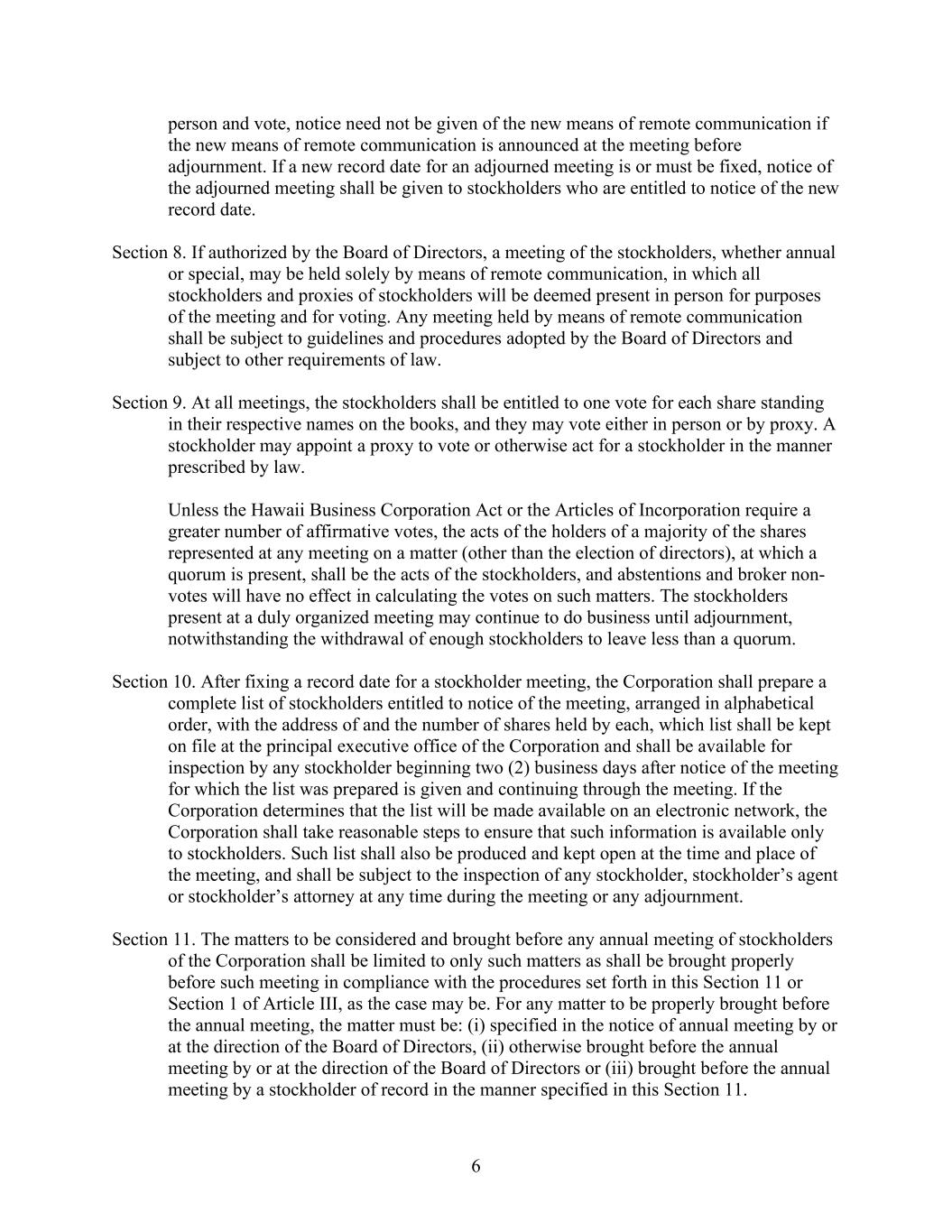 6 person and vote, notice need not be given of the new means of remote communication if the new means of remote communication is announced at the meeting before adjournment. If a new record date for an adjourned meeting is or must be fixed, notice of the adjourned meeting shall be given to stockholders who are entitled to notice of the new record date. Section 8. If authorized by the Board of Directors, a meeting of the stockholders, whether annual or special, may be held solely by means of remote communication, in which all stockholders and proxies of stockholders will be deemed present in person for purposes of the meeting and for voting. Any meeting held by means of remote communication shall be subject to guidelines and procedures adopted by the Board of Directors and subject to other requirements of law. Section 9. At all meetings, the stockholders shall be entitled to one vote for each share standing in their respective names on the books, and they may vote either in person or by proxy. A stockholder may appoint a proxy to vote or otherwise act for a stockholder in the manner prescribed by law. Unless the Hawaii Business Corporation Act or the Articles of Incorporation require a greater number of affirmative votes, the acts of the holders of a majority of the shares represented at any meeting on a matter (other than the election of directors), at which a quorum is present, shall be the acts of the stockholders, and abstentions and broker non- votes will have no effect in calculating the votes on such matters. The stockholders present at a duly organized meeting may continue to do business until adjournment, notwithstanding the withdrawal of enough stockholders to leave less than a quorum. Section 10. After fixing a record date for a stockholder meeting, the Corporation shall prepare a complete list of stockholders entitled to notice of the meeting, arranged in alphabetical order, with the address of and the number of shares held by each, which list shall be kept on file at the principal executive office of the Corporation and shall be available for inspection by any stockholder beginning two (2) business days after notice of the meeting for which the list was prepared is given and continuing through the meeting. If the Corporation determines that the list will be made available on an electronic network, the Corporation shall take reasonable steps to ensure that such information is available only to stockholders. Such list shall also be produced and kept open at the time and place of the meeting, and shall be subject to the inspection of any stockholder, stockholder’s agent or stockholder’s attorney at any time during the meeting or any adjournment. Section 11. The matters to be considered and brought before any annual meeting of stockholders of the Corporation shall be limited to only such matters as shall be brought properly before such meeting in compliance with the procedures set forth in this Section 11 or Section 1 of Article III, as the case may be. For any matter to be properly brought before the annual meeting, the matter must be: (i) specified in the notice of annual meeting by or at the direction of the Board of Directors, (ii) otherwise brought before the annual meeting by or at the direction of the Board of Directors or (iii) brought before the annual meeting by a stockholder of record in the manner specified in this Section 11.