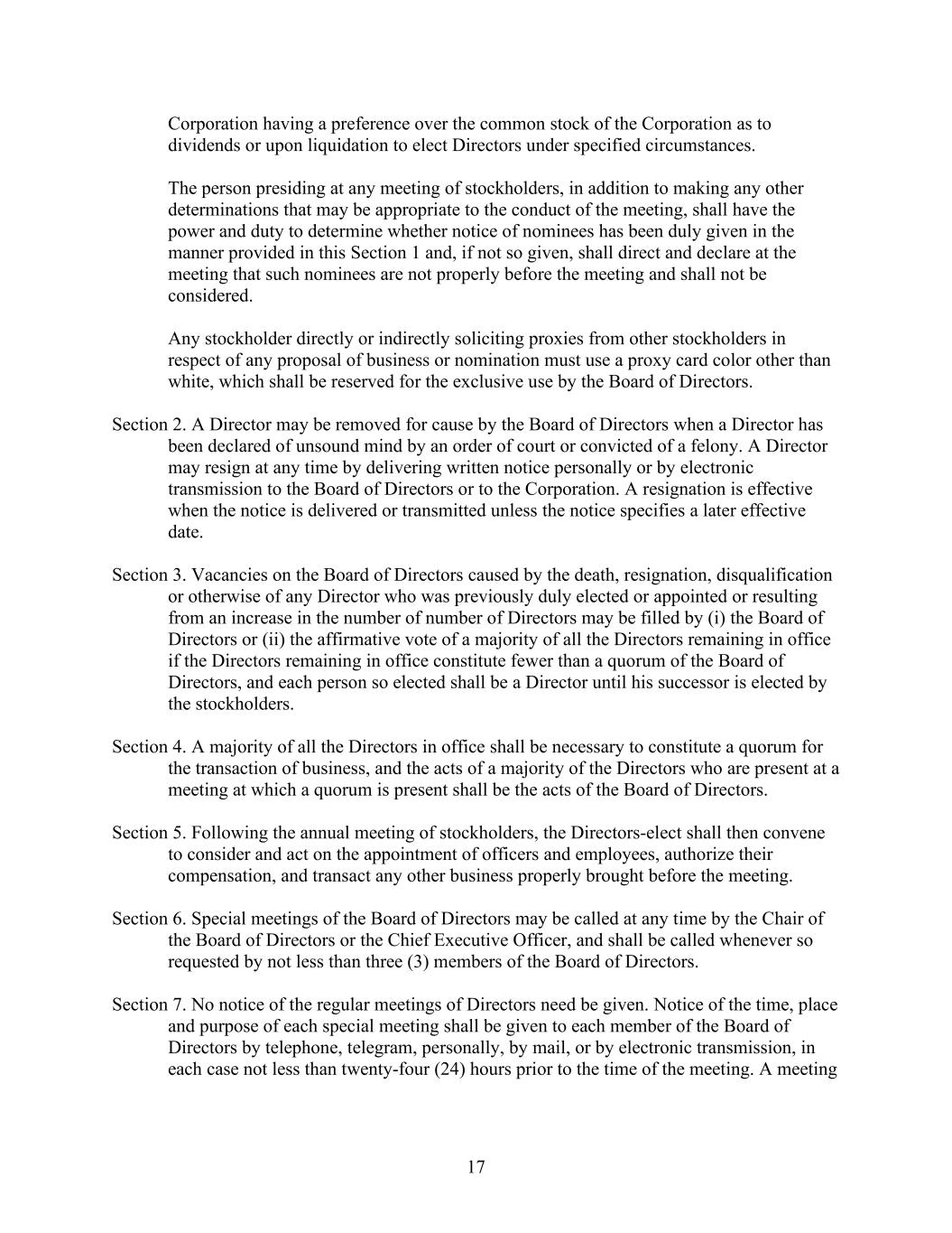 17 Corporation having a preference over the common stock of the Corporation as to dividends or upon liquidation to elect Directors under specified circumstances. The person presiding at any meeting of stockholders, in addition to making any other determinations that may be appropriate to the conduct of the meeting, shall have the power and duty to determine whether notice of nominees has been duly given in the manner provided in this Section 1 and, if not so given, shall direct and declare at the meeting that such nominees are not properly before the meeting and shall not be considered. Any stockholder directly or indirectly soliciting proxies from other stockholders in respect of any proposal of business or nomination must use a proxy card color other than white, which shall be reserved for the exclusive use by the Board of Directors. Section 2. A Director may be removed for cause by the Board of Directors when a Director has been declared of unsound mind by an order of court or convicted of a felony. A Director may resign at any time by delivering written notice personally or by electronic transmission to the Board of Directors or to the Corporation. A resignation is effective when the notice is delivered or transmitted unless the notice specifies a later effective date. Section 3. Vacancies on the Board of Directors caused by the death, resignation, disqualification or otherwise of any Director who was previously duly elected or appointed or resulting from an increase in the number of number of Directors may be filled by (i) the Board of Directors or (ii) the affirmative vote of a majority of all the Directors remaining in office if the Directors remaining in office constitute fewer than a quorum of the Board of Directors, and each person so elected shall be a Director until his successor is elected by the stockholders. Section 4. A majority of all the Directors in office shall be necessary to constitute a quorum for the transaction of business, and the acts of a majority of the Directors who are present at a meeting at which a quorum is present shall be the acts of the Board of Directors. Section 5. Following the annual meeting of stockholders, the Directors-elect shall then convene to consider and act on the appointment of officers and employees, authorize their compensation, and transact any other business properly brought before the meeting. Section 6. Special meetings of the Board of Directors may be called at any time by the Chair of the Board of Directors or the Chief Executive Officer, and shall be called whenever so requested by not less than three (3) members of the Board of Directors. Section 7. No notice of the regular meetings of Directors need be given. Notice of the time, place and purpose of each special meeting shall be given to each member of the Board of Directors by telephone, telegram, personally, by mail, or by electronic transmission, in each case not less than twenty-four (24) hours prior to the time of the meeting. A meeting