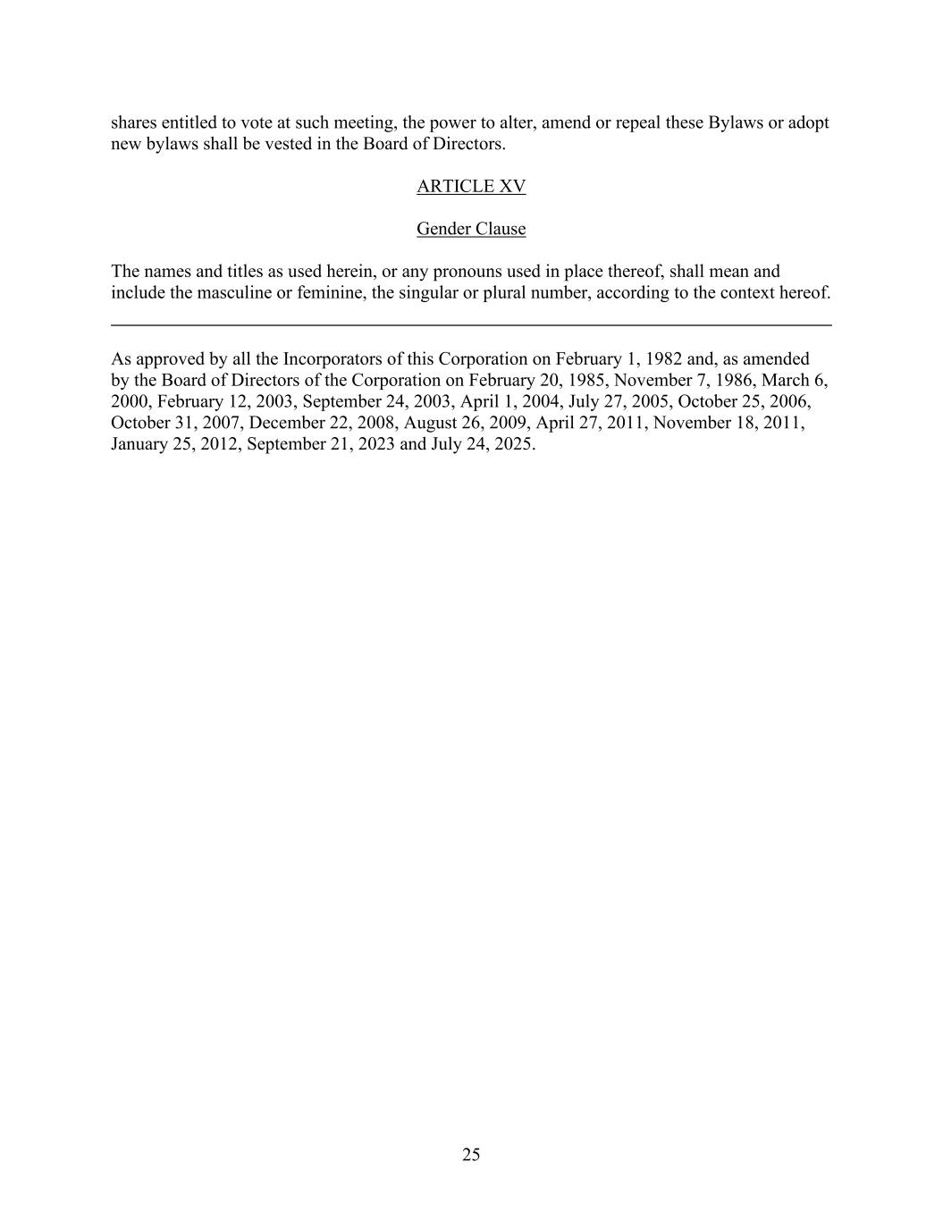 25 shares entitled to vote at such meeting, the power to alter, amend or repeal these Bylaws or adopt new bylaws shall be vested in the Board of Directors. ARTICLE XV Gender Clause The names and titles as used herein, or any pronouns used in place thereof, shall mean and include the masculine or feminine, the singular or plural number, according to the context hereof. As approved by all the Incorporators of this Corporation on February 1, 1982 and, as amended by the Board of Directors of the Corporation on February 20, 1985, November 7, 1986, March 6, 2000, February 12, 2003, September 24, 2003, April 1, 2004, July 27, 2005, October 25, 2006, October 31, 2007, December 22, 2008, August 26, 2009, April 27, 2011, November 18, 2011, January 25, 2012, September 21, 2023 and July 24, 2025.