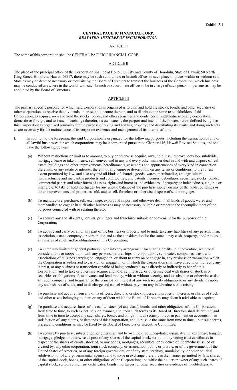 Exhibit 3.1 CENTRAL PACIFIC FINANCIAL CORP. RESTATED ARTICLES OF INCORPORATION ARTICLE I The name of this corporation shall be CENTRAL PACIFIC FINANCIAL CORP. ARTICLE II The place of the principal office of the Corporation shall be at Honolulu, City and County of Honolulu, State of Hawaii; 50 North King Street, Honolulu, Hawaii 96817, there may be such subordinate or branch offices in such place or places within or without said State as may be deemed necessary or requisite by the Board of Directors to transact the business of the Corporation, which business may be conducted anywhere in the world, with such branch or subordinate offices to be in charge of such person or persons as may be appointed by the Board of Directors. ARTICLE III The primary specific purpose for which said Corporation is organized is to own and hold the stocks, bonds, and other securities of other corporation, to receive the dividends, interest, and income thereon, and to distribute the same to stockholders of this Corporation; to acquire, own and hold the stocks, bonds, and other securities and evidences of indebtedness of any corporation, domestic or foreign, and to issue in exchange therefor, its own stocks, the purport and intent of the powers herein defined being that this Corporation is organized primarily for the purpose of owing and holding property; and distributing its avails, and doing such acts as are necessary for the maintenance of its corporate existence and management of its internal affairs. l. In addition to the foregoing, the said Corporation is organized for the following purposes, including the transaction of any or all lawful businesses for which corporations may be incorporated pursuant to Chapter 416, Hawaii Revised Statutes, and shall have the following powers: (a) Without restrictions or limit as to amount, to buy or otherwise acquire, own, hold, use, improve, develop, subdivide, mortgage, lease or take on lease, sell, convey and in any and every other manner deal in and with and dispose of real estate, buildings and other improvements, hereditaments, easements and appurtenances of every kind in connection therewith, or any estate or interests therein, of any tenure or description, on any terms or conditions, to the fullest extent permitted by law, and also any and all kinds of chattels, goods, wares, merchandise, and agricultural, manufacturing and mercantile products and commodities, and patents, licenses, debentures, securities, stocks, bonds, commercial paper, and other forms of assets, rights and interests and evidences of property or indebtedness, tangible or intangible; to take or hold mortgages for any unpaid balance of the purchase money on any of the lands, buildings or other improvements and properties sold, and to sell, foreclose or otherwise dispose of said mortgages; (b) To manufacture, purchase, sell, exchange, export and import and otherwise deal in all kinds of goods, wares and merchandise; to engage in such other business as may be necessary, suitable or proper to the accomplishment of the purposes connected with or relating thereto; (c) To acquire any and all rights, permits, privileges and franchises suitable or convenient for the purposes of the Corporation; (d) To acquire and carry on all or any part of the business or property and to undertake any liabilities of any person, firm, association, estate, company, or corporation and as the consideration for the same to pay cash, property, and/or to issue any shares of stock and/or obligations of this Corporation; (e) To enter into limited or general partnership or into any arrangement for sharing profits, joint adventure, reciprocal considerations or cooperation with any persons, partnerships, or corporations, syndicates, companies, trusts and associations of all kinds carrying on, engaged in, or about to carry on or engage in, any business or transaction which the Corporation is authorized to carry on or engage in, or in which the Corporation shall have directly or indirectly any interest, or any business or transaction capable of being conducted so as directly or indirectly to benefit this Corporation, and to take or otherwise acquire and hold, sell, reissue, or otherwise deal with shares of stock in or securities or obligations of, to advance and lend money, with or without security, and to subsidize or otherwise assist any such company, and to guarantee the principal or interest of any such security obligations, or any dividends upon any such shares of stock, and to discharge and cancel without payment any indebtedness thus arising; (f) To purchase and acquire from any of its officers, directors, or stockholders, any property, interests, or shares of stock and other assets belonging to them or any of them which the Board of Directors may deem it advisable to acquire; (g) To purchase and acquire shares of the capital stock (of any class), bonds, and other obligations of this Corporation, from time to time, to such extent, in such manner, and upon such terms as its Board of Directors shall determine; and from time to time to accept any such shares, bonds, and obligations as security for, or in payment on accounts, or in satisfaction of, any claims, or demands of this Corporation, and to reissue the same from time to time, upon such terms, prices, and conditions as may be fixed by its Board of Directors or Executive Committee; (h) To acquire by purchase, subscription, or otherwise, and to own, hold, sell, negotiate, assign, deal in, exchange, transfer, mortgage, pledge, or otherwise dispose of any shares of the capital stock, script, or any voting trust certificates in respect of the shares of capital stock of, or any bonds, mortgages, securities, or evidence of indebtedness issued or created by, any other corporation, joint stock company, or association, public or private, or of the government of the United States of America, or of any foreign government, or of any state, territory, municipality, or other political subdi
