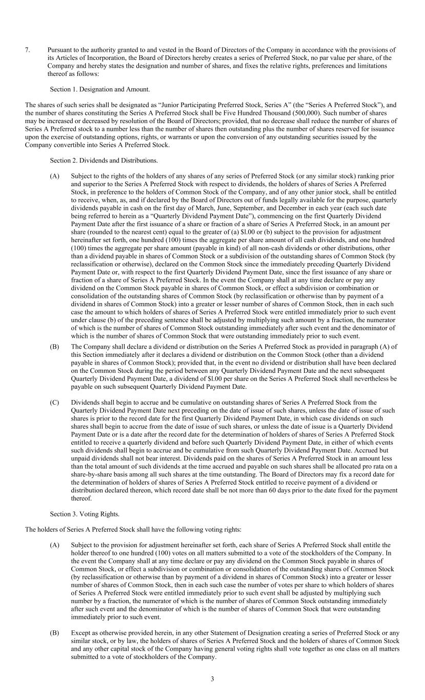7. Pursuant to the authority granted to and vested in the Board of Directors of the Company in accordance with the provisions of its Articles of Incorporation, the Board of Directors hereby creates a series of Preferred Stock, no par value per share, of the Company and hereby states the designation and number of shares, and fixes the relative rights, preferences and limitations thereof as follows: Section 1. Designation and Amount. The shares of such series shall be designated as “Junior Participating Preferred Stock, Series A” (the “Series A Preferred Stock”), and the number of shares constituting the Series A Preferred Stock shall be Five Hundred Thousand (500,000). Such number of shares may be increased or decreased by resolution of the Board of Directors; provided, that no decrease shall reduce the number of shares of Series A Preferred stock to a number less than the number of shares then outstanding plus the number of shares reserved for issuance upon the exercise of outstanding options, rights, or warrants or upon the conversion of any outstanding securities issued by the Company convertible into Series A Preferred Stock. Section 2. Dividends and Distributions. (A) Subject to the rights of the holders of any shares of any series of Preferred Stock (or any similar stock) ranking prior and superior to the Series A Preferred Stock with respect to dividends, the holders of shares of Series A Preferred Stock, in preference to the holders of Common Stock of the Company, and of any other junior stock, shall be entitled to receive, when, as, and if declared by the Board of Directors out of funds legally available for the purpose, quarterly dividends payable in cash on the first day of March, June, September, and December in each year (each such date being referred to herein as a “Quarterly Dividend Payment Date”), commencing on the first Quarterly Dividend Payment Date after the first issuance of a share or fraction of a share of Series A Preferred Stock, in an amount per share (rounded to the nearest cent) equal to the greater of (a) $l.00 or (b) subject to the provision for adjustment hereinafter set forth, one hundred (100) times the aggregate per share amount of all cash dividends, and one hundred (100) times the aggregate per share amount (payable in kind) of all non-cash dividends or other distributions, other than a dividend payable in shares of Common Stock or a subdivision of the outstanding shares of Common Stock (by reclassification or otherwise), declared on the Common Stock since the immediately preceding Quarterly Dividend Payment Date or, with respect to the first Quarterly Dividend Payment Date, since the first issuance of any share or fraction of a share of Series A Preferred Stock. In the event the Company shall at any time declare or pay any dividend on the Common Stock payable in shares of Common Stock, or effect a subdivision or combination or consolidation of the outstanding shares of Common Stock (by reclassification or otherwise than by payment of a dividend in shares of Common Stock) into a greater or lesser number of shares of Common Stock, then in each such case the amount to which holders of shares of Series A Preferred Stock were entitled immediately prior to such event under clause (b) of the preceding sentence shall be adjusted by multiplying such amount by a fraction, the numerator of which is the number of shares of Common Stock outstanding immediately after such event and the denominator of which is the number of shares of Common Stock that were outstanding immediately prior to such event. (B) The Company shall declare a dividend or distribution on the Series A Preferred Stock as provided in paragraph (A) of this Section immediately after it declares a dividend or distribution on the Common Stock (other than a dividend payable in shares of Common Stock); provided that, in the event no dividend or distribution shall have been declared on the Common Stock during the period between any Quarterly Dividend Payment Date and the next subsequent Quarterly Dividend Payment Date, a dividend of $l.00 per share on the Series A Preferred Stock shall nevertheless be payable on such subsequent Quarterly Dividend Payment Date. (C) Dividends shall begin to accrue and be cumulative on outstanding shares of Series A Preferred Stock from the Quarterly Dividend Payment Date next preceding on the date of issue of such shares, unless the date of issue of such shares is prior to the record date for the first Quarterly Dividend Payment Date, in which case dividends on such shares shall begin to accrue from the date of issue of such shares, or unless the date of issue is a Quarterly Dividend Payment Date or is a date after the record date for the determination of holders of shares of Series A Preferred Stock entitled to receive a quarterly dividend and before such Quarterly Dividend Payment Date, in either of which events such dividends shall begin to accrue and be cumulative from such Quarterly Dividend Payment Date. Accrued but unpaid dividends shall not bear interest. Dividends paid on the shares of Series A Preferred Stock in an amount less than the total amount of such dividends at the time accrued and payable on such shares shall be allocated pro rata on a share-by-share basis among all such shares at the time outstanding. The Board of Directors may fix a record date for the determination of holders of shares of Series A Preferred Stock entitled to receive payment of a dividend or distribution declared thereon, which record date shall be not more than 60 days prior to the date fixed for the payment thereof. Section 3. Voting Rights. The holders of Series A Preferred Stock shall have the following voting rights: (A) Subject to the provision for adjustment hereinafter set forth, each share of Series A Preferred Stock shall entitle the holder thereof to one hundred (100) votes on all matters submitted to a vote of the stockholders of the Company. In the event the Co