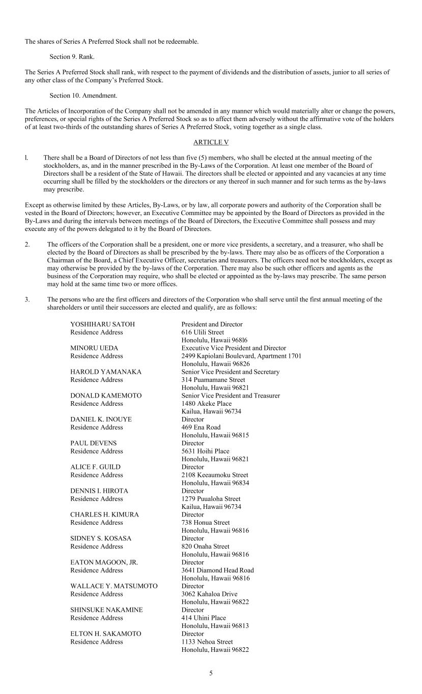 The shares of Series A Preferred Stock shall not be redeemable. Section 9. Rank. The Series A Preferred Stock shall rank, with respect to the payment of dividends and the distribution of assets, junior to all series of any other class of the Company’s Preferred Stock. Section 10. Amendment. The Articles of Incorporation of the Company shall not be amended in any manner which would materially alter or change the powers, preferences, or special rights of the Series A Preferred Stock so as to affect them adversely without the affirmative vote of the holders of at least two-thirds of the outstanding shares of Series A Preferred Stock, voting together as a single class. ARTICLE V l. There shall be a Board of Directors of not less than five (5) members, who shall be elected at the annual meeting of the stockholders, as, and in the manner prescribed in the By-Laws of the Corporation. At least one member of the Board of Directors shall be a resident of the State of Hawaii. The directors shall be elected or appointed and any vacancies at any time occurring shall be filled by the stockholders or the directors or any thereof in such manner and for such terms as the by-laws may prescribe. Except as otherwise limited by these Articles, By-Laws, or by law, all corporate powers and authority of the Corporation shall be vested in the Board of Directors; however, an Executive Committee may be appointed by the Board of Directors as provided in the By-Laws and during the intervals between meetings of the Board of Directors, the Executive Committee shall possess and may execute any of the powers delegated to it by the Board of Directors. 2. The officers of the Corporation shall be a president, one or more vice presidents, a secretary, and a treasurer, who shall be elected by the Board of Directors as shall be prescribed by the by-laws. There may also be as officers of the Corporation a Chairman of the Board, a Chief Executive Officer, secretaries and treasurers. The officers need not be stockholders, except as may otherwise be provided by the by-laws of the Corporation. There may also be such other officers and agents as the business of the Corporation may require, who shall be elected or appointed as the by-laws may prescribe. The same person may hold at the same time two or more offices. 3. The persons who are the first officers and directors of the Corporation who shall serve until the first annual meeting of the shareholders or until their successors are elected and qualify, are as follows: YOSHIHARU SATOH President and Director Residence Address 616 Ulili Street Honolulu, Hawaii 968l6 MINORU UEDA Executive Vice President and Director Residence Address 2499 Kapiolani Boulevard, Apartment 1701 Honolulu, Hawaii 96826 HAROLD YAMANAKA Senior Vice President and Secretary Residence Address 314 Puamamane Street Honolulu, Hawaii 96821 DONALD KAMEMOTO Senior Vice President and Treasurer Residence Address 1480 Akeke Place Kailua, Hawaii 96734 DANIEL K. INOUYE Director Residence Address 469 Ena Road Honolulu, Hawaii 96815 PAUL DEVENS Director Residence Address 5631 Hoihi Place Honolulu, Hawaii 96821 ALICE F. GUILD Director Residence Address 2108 Keeaumoku Street Honolulu, Hawaii 96834 DENNIS I. HIROTA Director Residence Address 1279 Puualoha Street Kailua, Hawaii 96734 CHARLES H. KIMURA Director Residence Address 738 Honua Street Honolulu, Hawaii 96816 SIDNEY S. KOSASA Director Residence Address 820 Onaha Street Honolulu, Hawaii 96816 EATON MAGOON, JR. Director Residence Address 3641 Diamond Head Road Honolulu, Hawaii 96816 WALLACE Y. MATSUMOTO Director Residence Address 3062 Kahaloa Drive Honolulu, Hawaii 96822 SHINSUKE NAKAMINE Director Residence Address 414 Uhini Place Honolulu, Hawaii 96813 ELTON H. SAKAMOTO Director Residence Address 1133 Nehoa Street Honolulu, Hawaii 96822 5