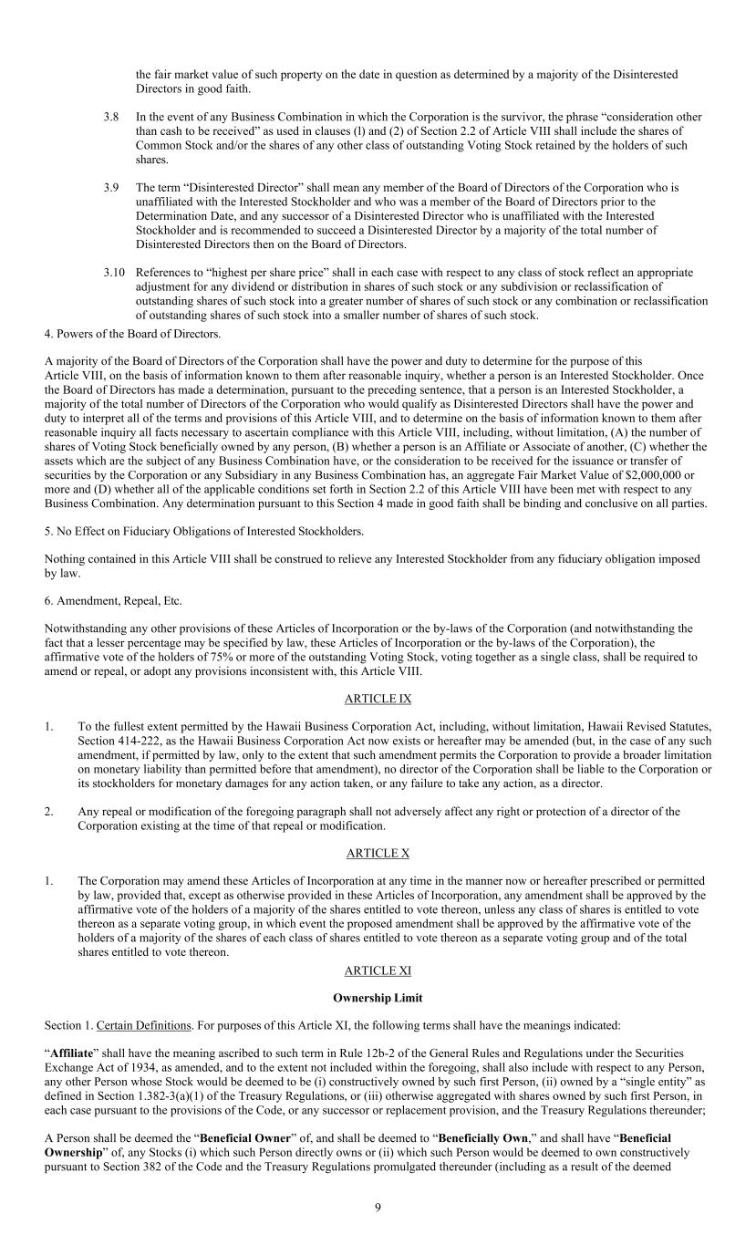 the fair market value of such property on the date in question as determined by a majority of the Disinterested Directors in good faith. 3.8 In the event of any Business Combination in which the Corporation is the survivor, the phrase “consideration other than cash to be received” as used in clauses (l) and (2) of Section 2.2 of Article VIII shall include the shares of Common Stock and/or the shares of any other class of outstanding Voting Stock retained by the holders of such shares. 3.9 The term “Disinterested Director” shall mean any member of the Board of Directors of the Corporation who is unaffiliated with the Interested Stockholder and who was a member of the Board of Directors prior to the Determination Date, and any successor of a Disinterested Director who is unaffiliated with the Interested Stockholder and is recommended to succeed a Disinterested Director by a majority of the total number of Disinterested Directors then on the Board of Directors. 3.10 References to “highest per share price” shall in each case with respect to any class of stock reflect an appropriate adjustment for any dividend or distribution in shares of such stock or any subdivision or reclassification of outstanding shares of such stock into a greater number of shares of such stock or any combination or reclassification of outstanding shares of such stock into a smaller number of shares of such stock. 4. Powers of the Board of Directors. A majority of the Board of Directors of the Corporation shall have the power and duty to determine for the purpose of this Article VIII, on the basis of information known to them after reasonable inquiry, whether a person is an Interested Stockholder. Once the Board of Directors has made a determination, pursuant to the preceding sentence, that a person is an Interested Stockholder, a majority of the total number of Directors of the Corporation who would qualify as Disinterested Directors shall have the power and duty to interpret all of the terms and provisions of this Article VIII, and to determine on the basis of information known to them after reasonable inquiry all facts necessary to ascertain compliance with this Article VIII, including, without limitation, (A) the number of shares of Voting Stock beneficially owned by any person, (B) whether a person is an Affiliate or Associate of another, (C) whether the assets which are the subject of any Business Combination have, or the consideration to be received for the issuance or transfer of securities by the Corporation or any Subsidiary in any Business Combination has, an aggregate Fair Market Value of $2,000,000 or more and (D) whether all of the applicable conditions set forth in Section 2.2 of this Article VIII have been met with respect to any Business Combination. Any determination pursuant to this Section 4 made in good faith shall be binding and conclusive on all parties. 5. No Effect on Fiduciary Obligations of Interested Stockholders. Nothing contained in this Article VIII shall be construed to relieve any Interested Stockholder from any fiduciary obligation imposed by law. 6. Amendment, Repeal, Etc. Notwithstanding any other provisions of these Articles of Incorporation or the by-laws of the Corporation (and notwithstanding the fact that a lesser percentage may be specified by law, these Articles of Incorporation or the by-laws of the Corporation), the affirmative vote of the holders of 75% or more of the outstanding Voting Stock, voting together as a single class, shall be required to amend or repeal, or adopt any provisions inconsistent with, this Article VIII. ARTICLE IX 1. To the fullest extent permitted by the Hawaii Business Corporation Act, including, without limitation, Hawaii Revised Statutes, Section 414-222, as the Hawaii Business Corporation Act now exists or hereafter may be amended (but, in the case of any such amendment, if permitted by law, only to the extent that such amendment permits the Corporation to provide a broader limitation on monetary liability than permitted before that amendment), no director of the Corporation shall be liable to the Corporation or its stockholders for monetary damages for any action taken, or any failure to take any action, as a director. 2. Any repeal or modification of the foregoing paragraph shall not adversely affect any right or protection of a director of the Corporation existing at the time of that repeal or modification. ARTICLE X 1. The Corporation may amend these Articles of Incorporation at any time in the manner now or hereafter prescribed or permitted by law, provided that, except as otherwise provided in these Articles of Incorporation, any amendment shall be approved by the affirmative vote of the holders of a majority of the shares entitled to vote thereon, unless any class of shares is entitled to vote thereon as a separate voting group, in which event the proposed amendment shall be approved by the affirmative vote of the holders of a majority of the shares of each class of shares entitled to vote thereon as a separate voting group and of the total shares entitled to vote thereon. ARTICLE XI Ownership Limit Section 1. Certain Definitions. For purposes of this Article XI, the following terms shall have the meanings indicated: “Affiliate” shall have the meaning ascribed to such term in Rule 12b-2 of the General Rules and Regulations under the Securities Exchange Act of 1934, as amended, and to the extent not included within the foregoing, shall also include with respect to any Person, any other Person whose Stock would be deemed to be (i) constructively owned by such first Person, (ii) owned by a “single entity” as defined in Section 1.382-3(a)(1) of the Treasury Regulations, or (iii) otherwise aggregated with shares owned by such first Person, in each case pursuant to the provisions of the Code, or any successor or replacement provision, and the Treasury Regulations thereunder; A Person shall be deemed the “Beneficial Owner”